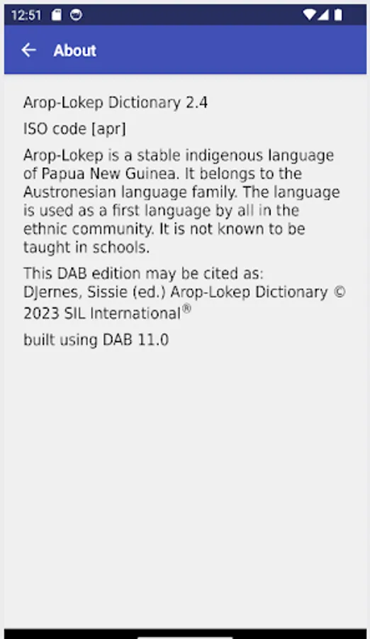 It belongs to the Austronesian language family. The language is used as a first language by all in the ethnic community. It is not known to be taught in schools.