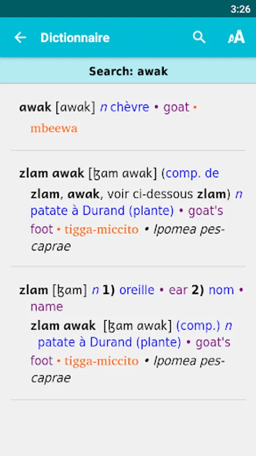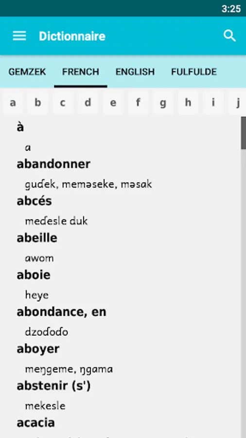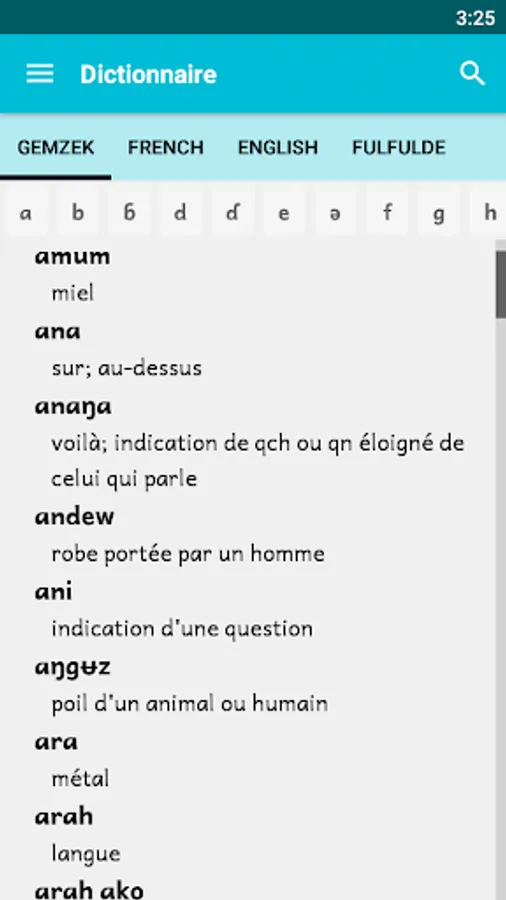 The Gemzek Dictionary app is intended for those who would like to look up Gemzek words to find the French, English or Fulfulde equivalent, or to find the Gemzek word via a French, English or Fulfulde gloss.