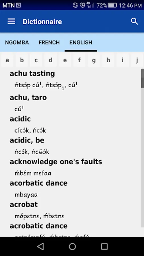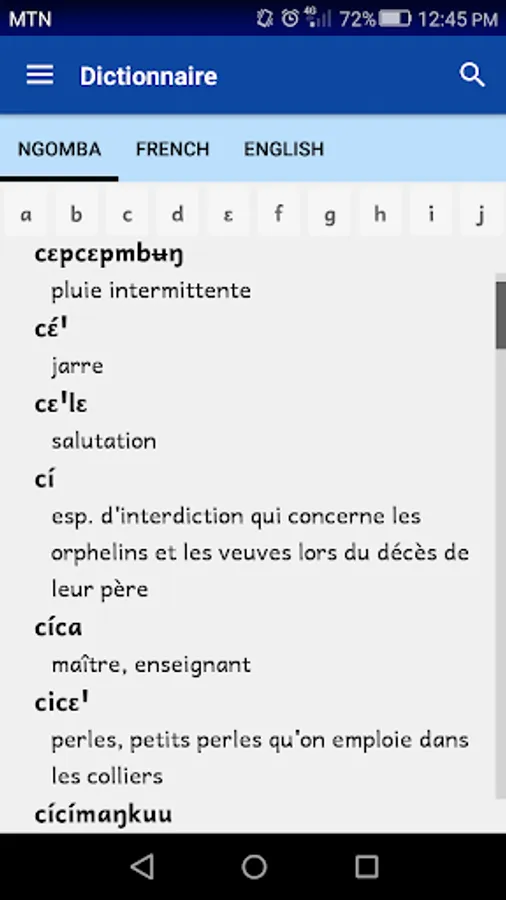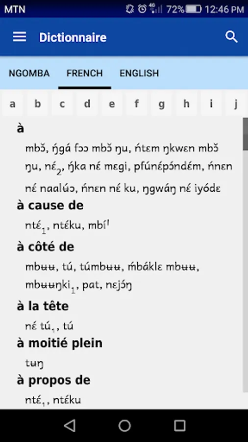The Ngomba Dictionary app is intended for those who would like to look up Ngomba words to find the French or English equivalent, or to find the Ngomba word via a French or English gloss.