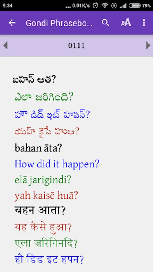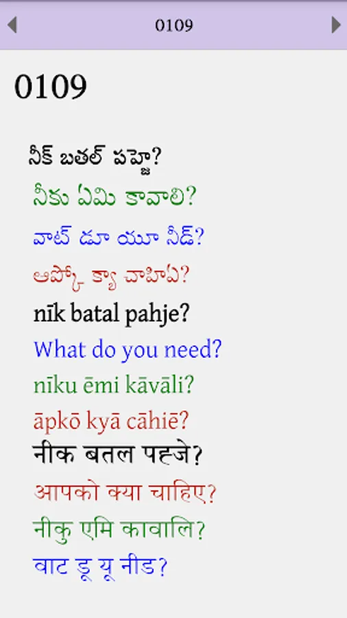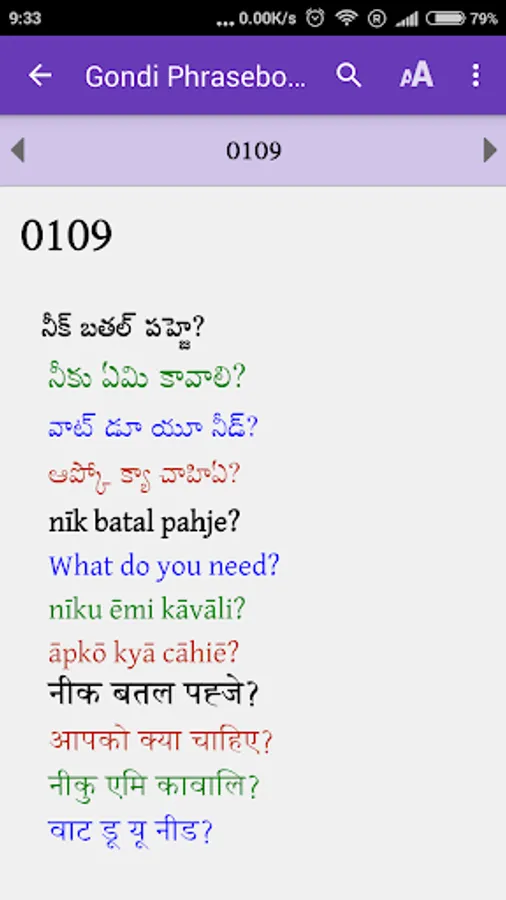 A unique feature of this phrasebook App is that the phrases are presented in several languages with multiple scripts. This will enable learners to learn other languages and scripts through whichever language and script they are most comfortable. An additional use for this App is for literate Gonds who wish to learn how to read and speak one of the other three languages presented (Telugu, English, or Hindi).