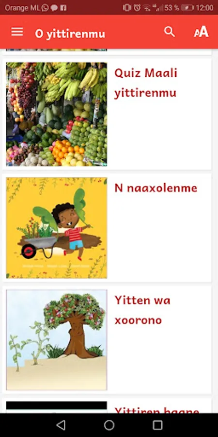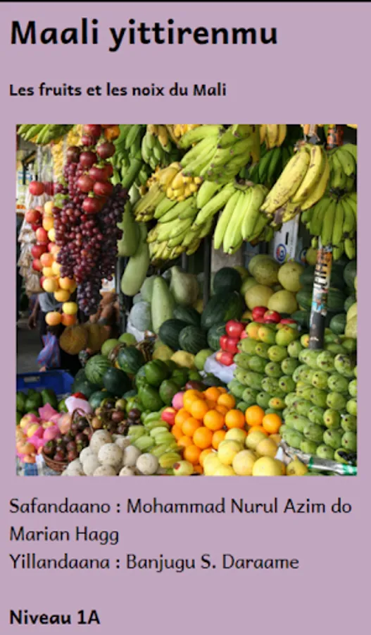 Here is "O yittirenmu", a five-book application that helps your children learn the names of fruits in the Soninke language. Fruits found everywhere in Mali and elsewhere. These educational books allow your children to also learn to count with fruits. A quiz is made to test their knowledge. Take advantage of this five reading books for pleasure in illustrated version, to listen to in audio version and to translate into other languages. And having a great time with your kids wherever you are.