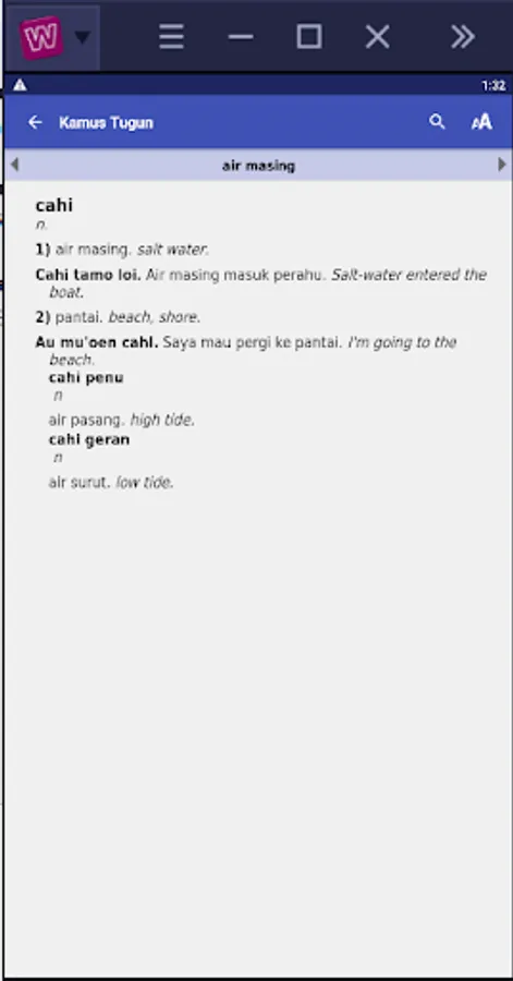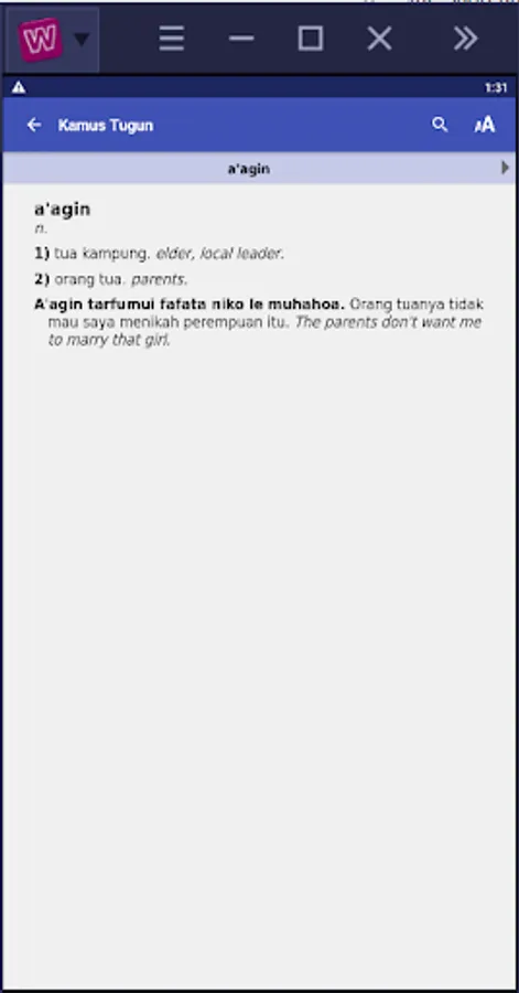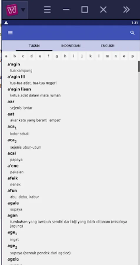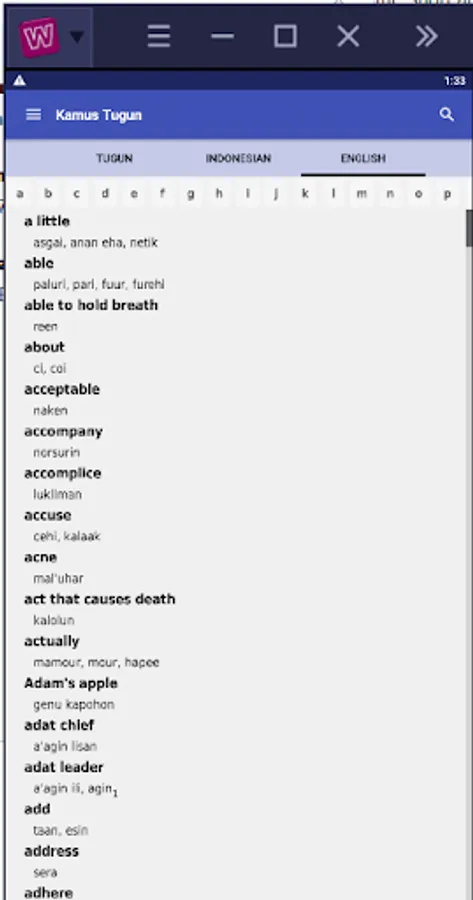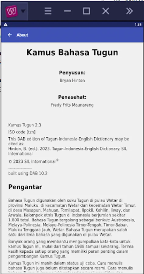 Kamus Tugun ini masih dalam status uji coba. Cara menulis bahasa Tugun juga belum ditetapkan secara resmi. Cara menulis bahasa Tugun di kamus ini berdasarkan hasil penelitian dan prinsip-prinsip ilmu bahasa, tetapi belum disepakati secara resmi oleh penutur asli Tugun yang berwewenang.