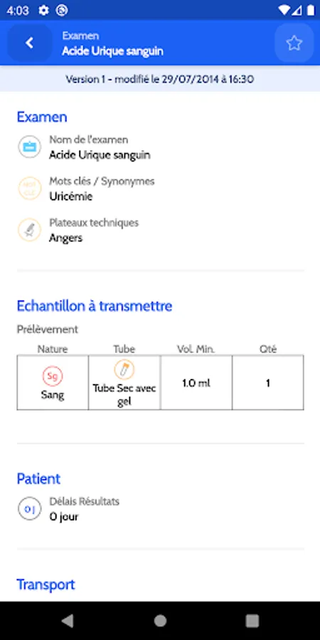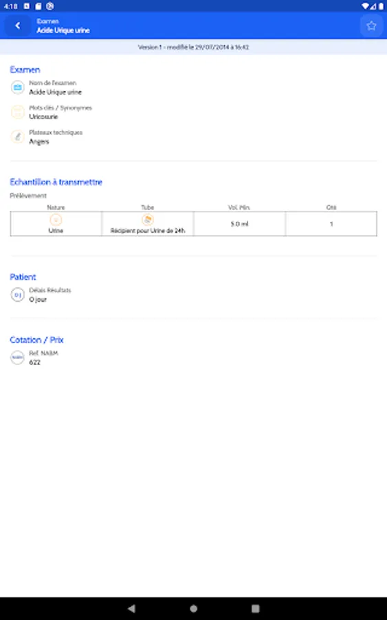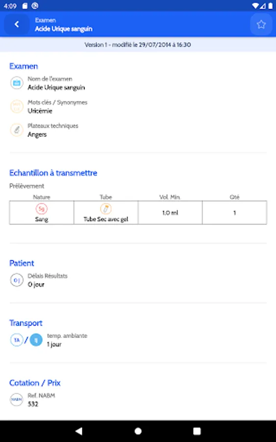 This application allows simple, fast and intuitive access to a vast repertoire of medical analysis. Each analysis has a descriptive sheet recalling the necessary information: nature, tube, storage temperature, time to result, sample volume, etc.