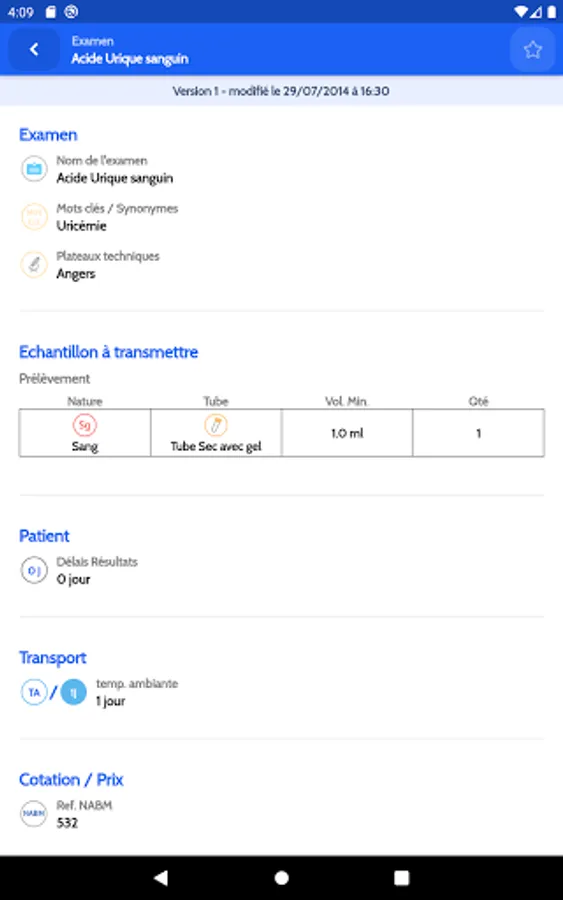 This application allows simple, fast and intuitive access to a vast repertoire of medical analyzes. Each analysis has a descriptive sheet recalling the necessary information: nature, tube, storage temperature, time before result, sample volume, etc.