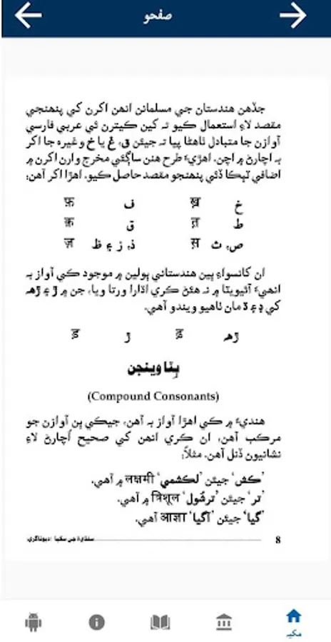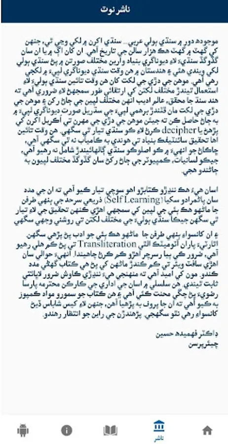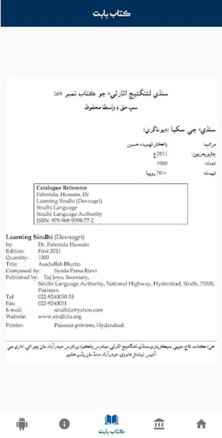 Sindhi Language Authority has designed this Android application (App) of a book named "Sindhi-a Ji Sikhia (Devnagri)". This is 14th Android Application created by Sindhi Language Authority. With the help of this self learning facility, people from both the sides of border can easily understand the language and literature of each other. This can also be helpful for such research oriented activities which can highlight different scripts of Sindhi Language, evolved from the Indus script of Mohenjo Daro, which has not been deciphered yet. This App consumes less memory space and can run offline (without internet connection). The book "Sindhi-a Ji Sikhiya (Devnagri)”,prepared by Dr. Fahmida Hussain was published in 2011.