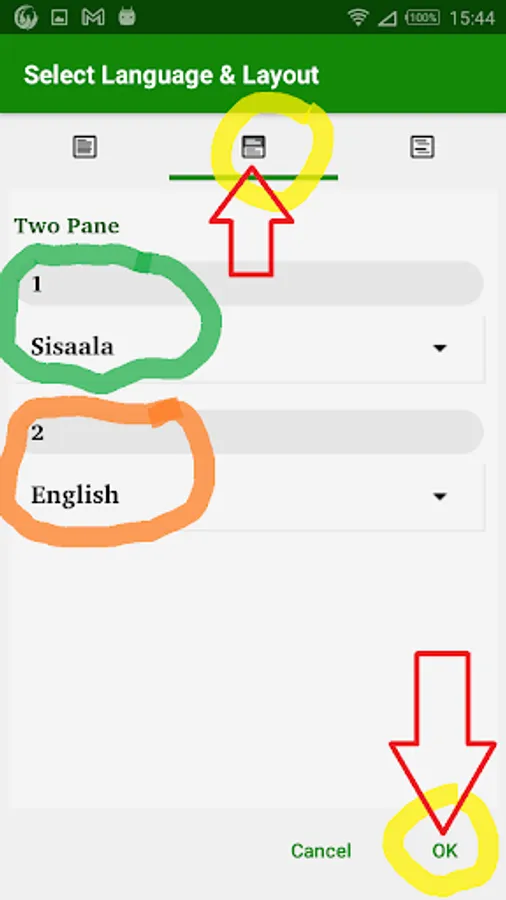 - "two panes" to display the Sisaala at the top and the English version at the bottom
