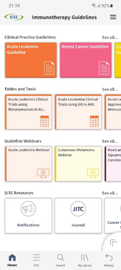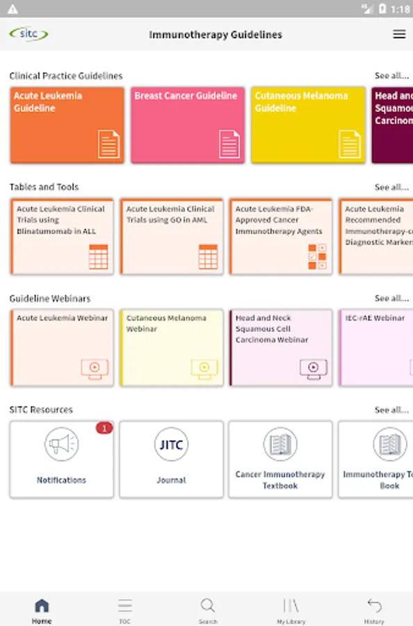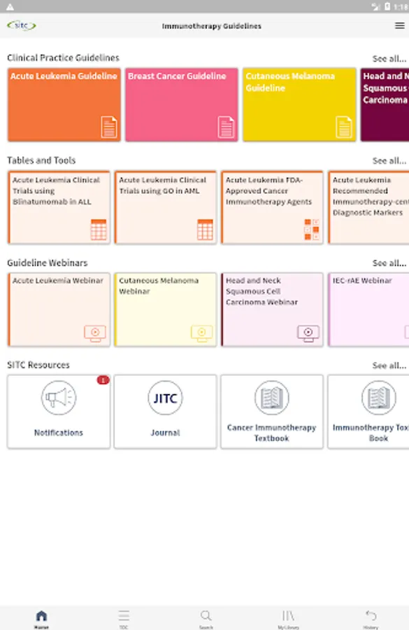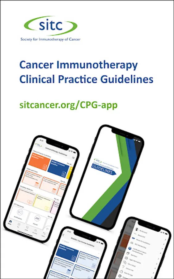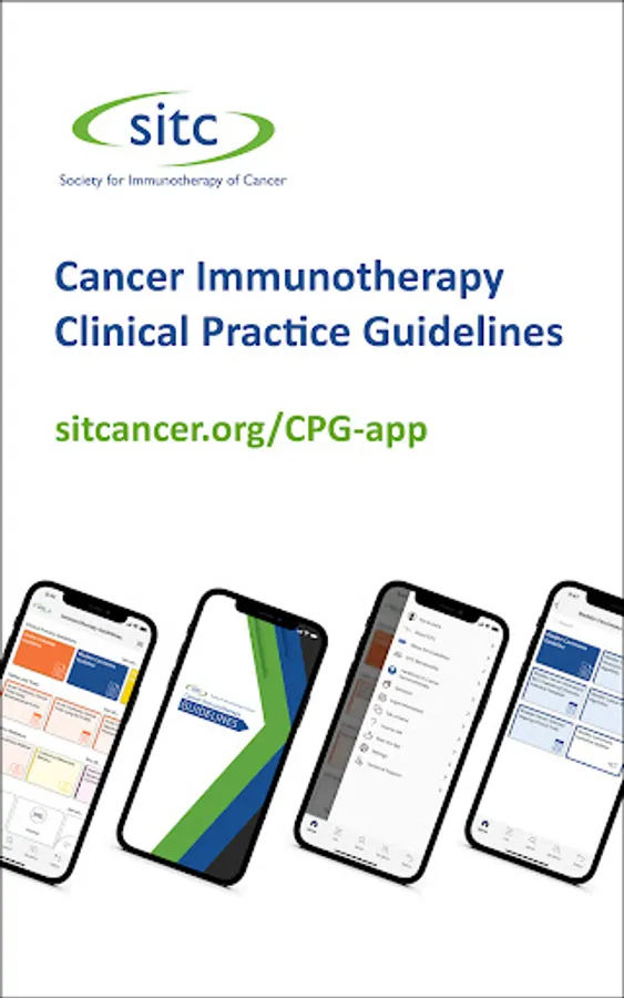 The Society for Immunotherapy of Cancer (SITC) Clinical Practice Guidelines (CPG) Mobile App is the first and only tool of its kind, offering direct, easy, portable access to SITC’s CPGs via phone or tablet. Highlighting key information from SITC’s published guidelines, the SITC CPG App features evidence- and expert consensus based-recommendations on all aspects of immunotherapy treatment as well as interactive tools and companion educational resources. From biomarkers and therapy selection to quality of life and management of immune-related adverse events, busy clinicians will find the SITC CPG App as the go-to resource on when and how to use immunotherapy to help improve outcomes for patients with cancer.