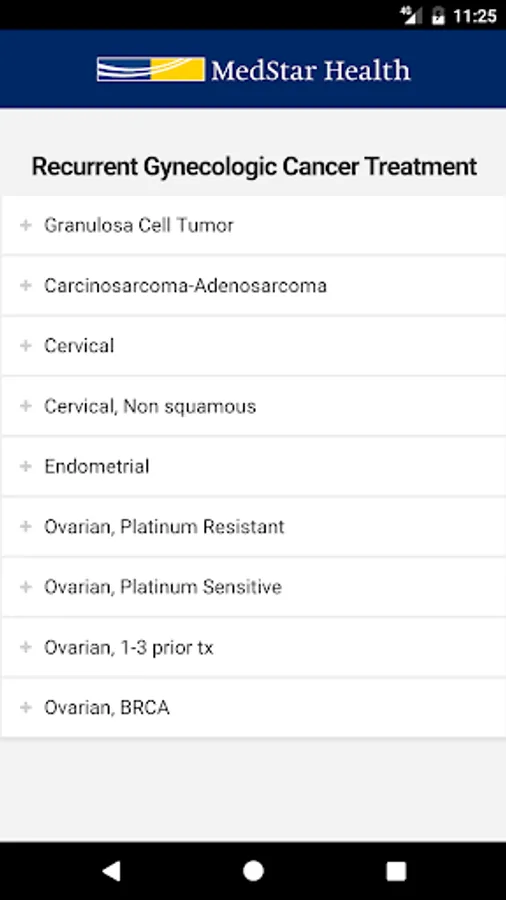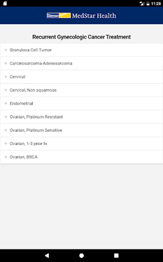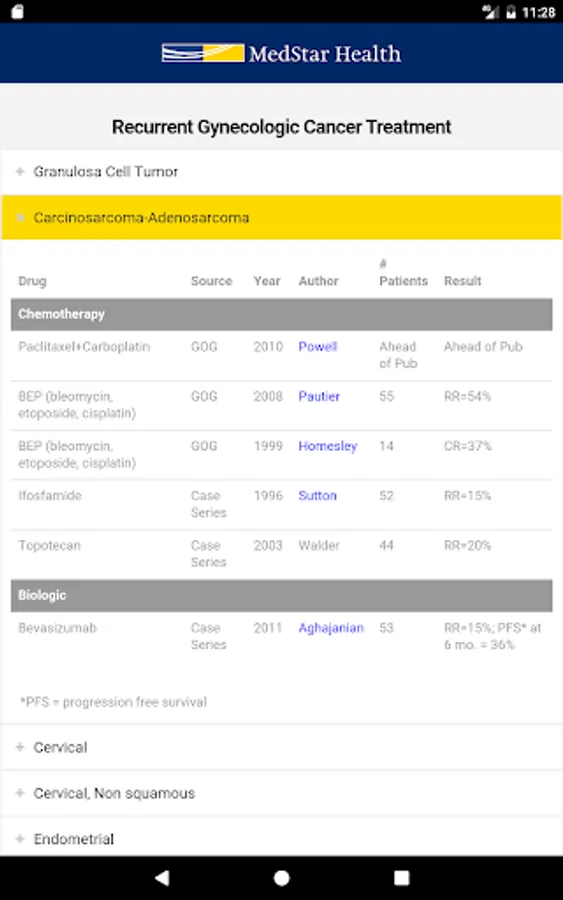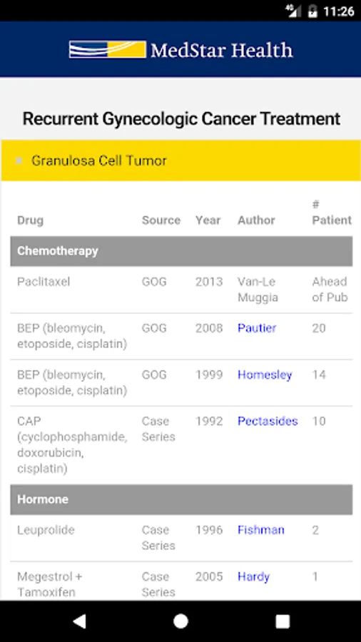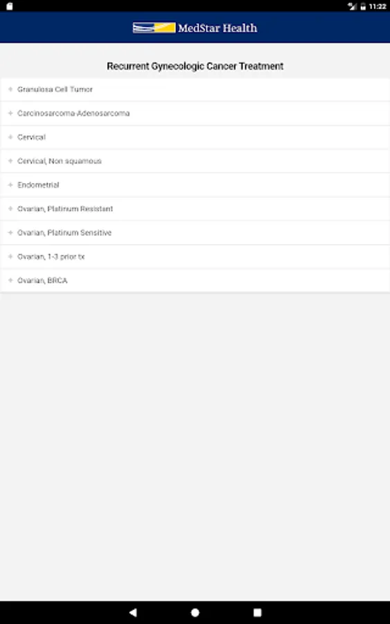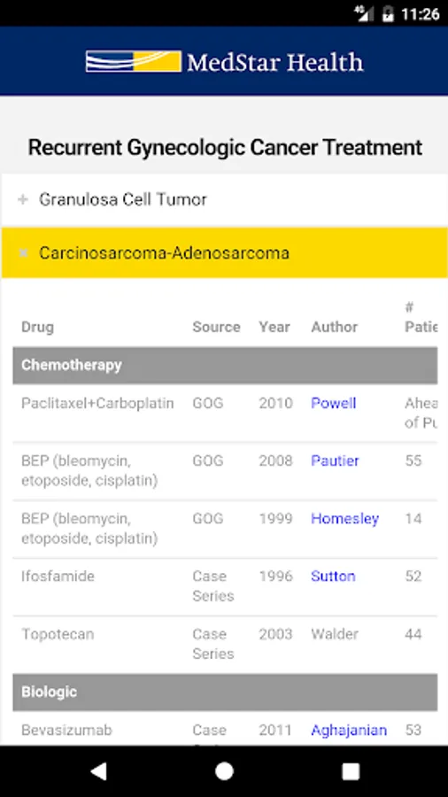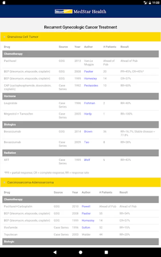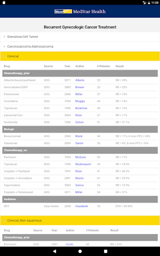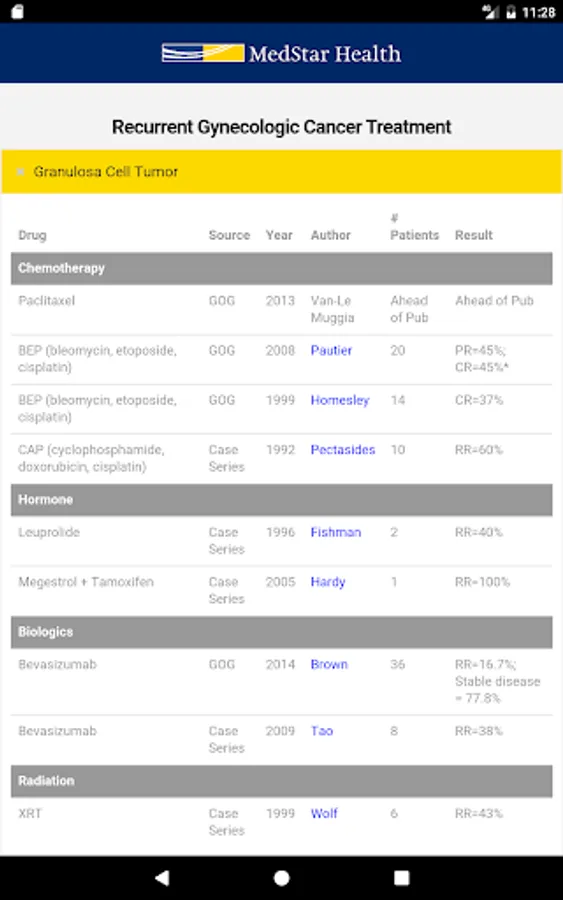 The Recurrent Gynecologic Cancer Treatment app synthesizes all randomized clinical trial data from the MedStar Health Gynecologic Oncology Group and other randomized control trials for recurrent gynecologic cancers. The ability to access relevant clinical trial data makes the that process of developing patient-specific regimens more efficient, accurate, and evidence-based.