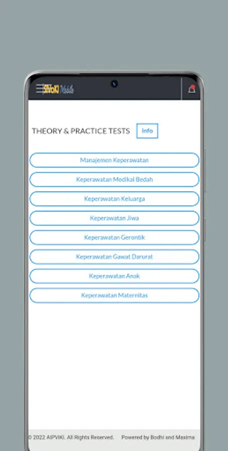 SIVoKI Mobile offers a new experience to diploma nurses preparing for the National Licensure Exam in Indonesia. The platform has detailed theory and practice tests for all the 8 sections of the exam namely Nursing Management, Medical Surgical Nursing, Family Nursing, Mental Health Nursing, Geriatric Nursing, Emergency Nursing, Pediatric Nursing and Maternity Nursing. This allows the students to build a strong foundation in each section of the exam. The system also has full length tests following the same pattern as that of the main examination. Students can go through detailed performance analytics and review their practice and full length tests on the system. The review section allows them to understand their strengths and weaknesses critical for their exam preparation. The last but not least the students can test their knowledge at the Final test, which has the same standard like in the national examination with 7 nursing competencies.
