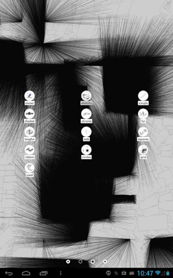 - drawing tools: simple line, pencil, shadow, fur, wool, chrome, squares, web, circles, ribbon, grid-pixel.