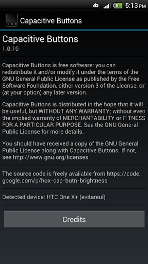 This application is free and open source, released under the GNU General Public License v3. The source code is available at https://code.google.com/p/hox-cap-butn-brightness, and further development information is available at the following thread on xda: http://forum.xda-developers.com/showthread.php?t=2496347