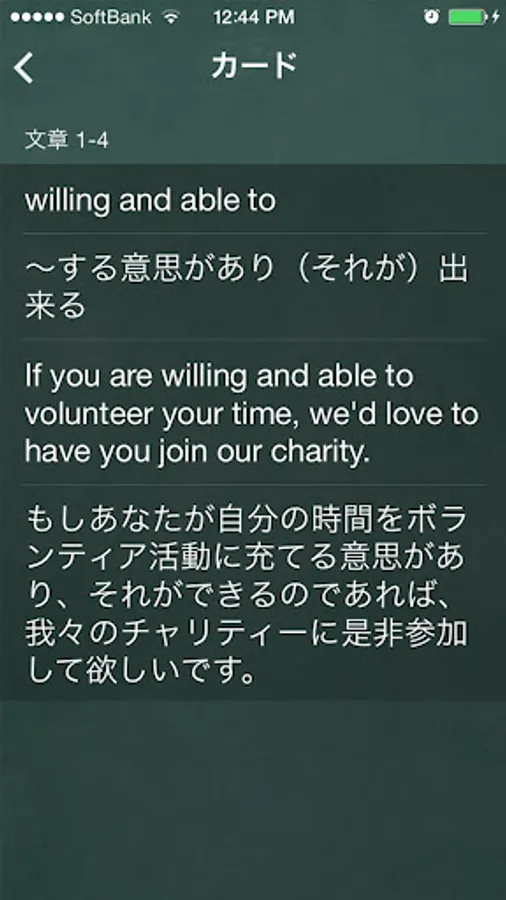 This flash card app, Japanese learners, general English to learn the app, you can learn a phrase that has been used most often in English as a phrase. This app, are included 3,000 phrases that have been carefully selected from among the English comprehensive education app "English master 10,000". Phrases of these 3000, most of the words that are included in those express by using a different representation English, in addition to the each of the phrases are accompanied by example sentences, not Japanese translation also affixed to each phrases and sentences you.