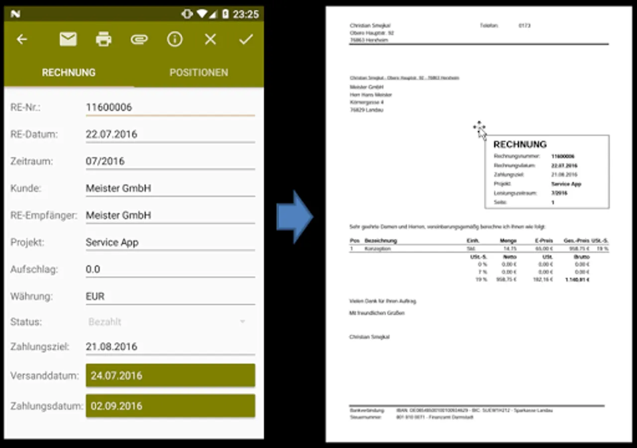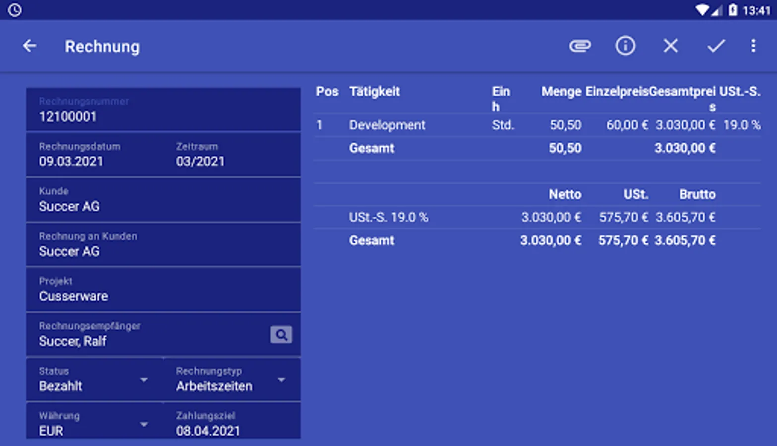 At the end of the month you automatically create all invoices for your customers. For each project an invoice is generated for all not yet invoiced hours of a month. You can also generate several invoices per month.