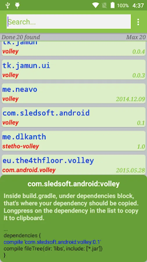 - Tap on an item and view the dependency signature that has to be added to Gradle.