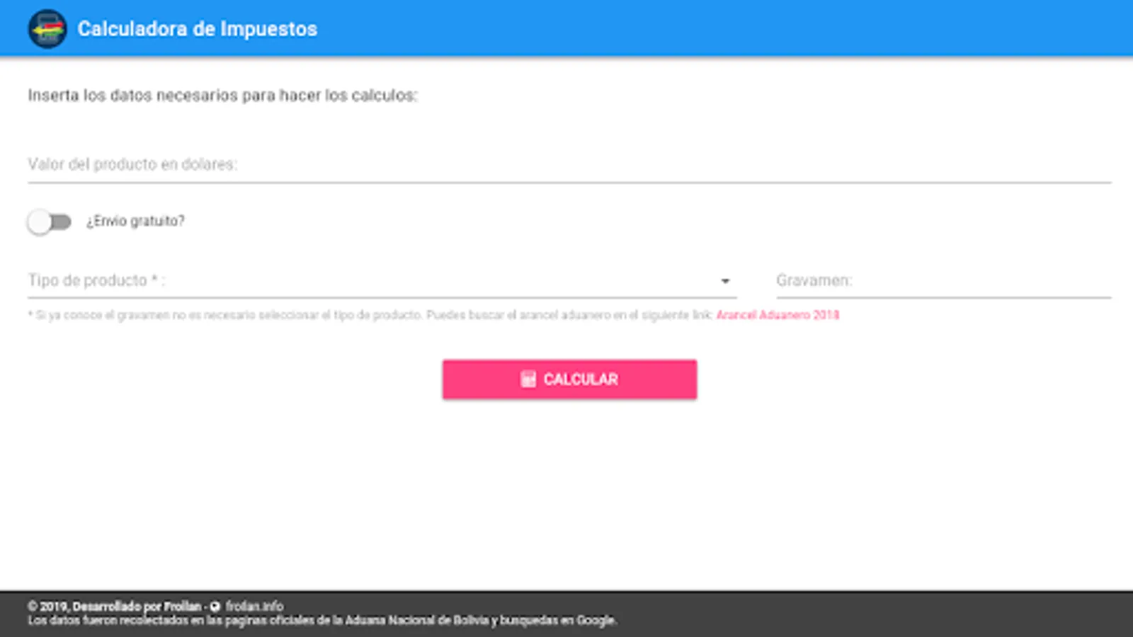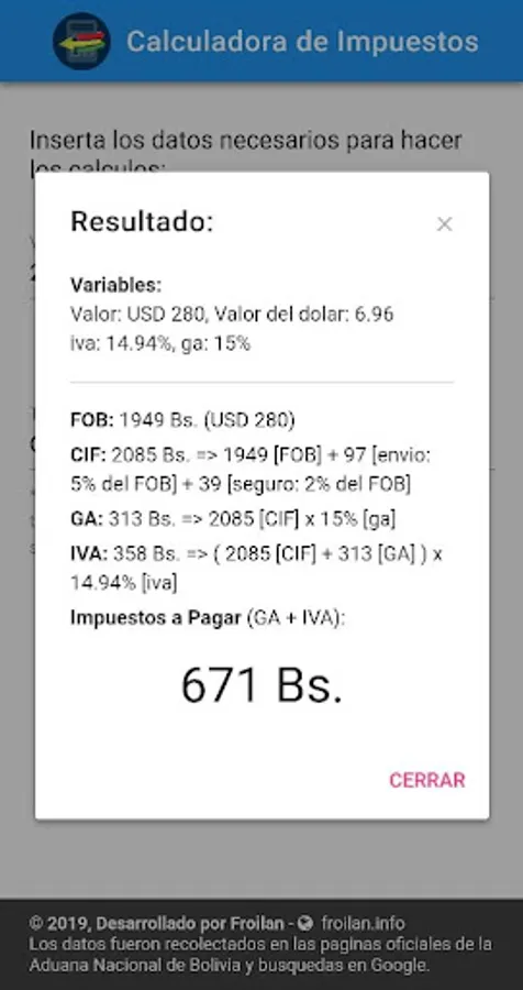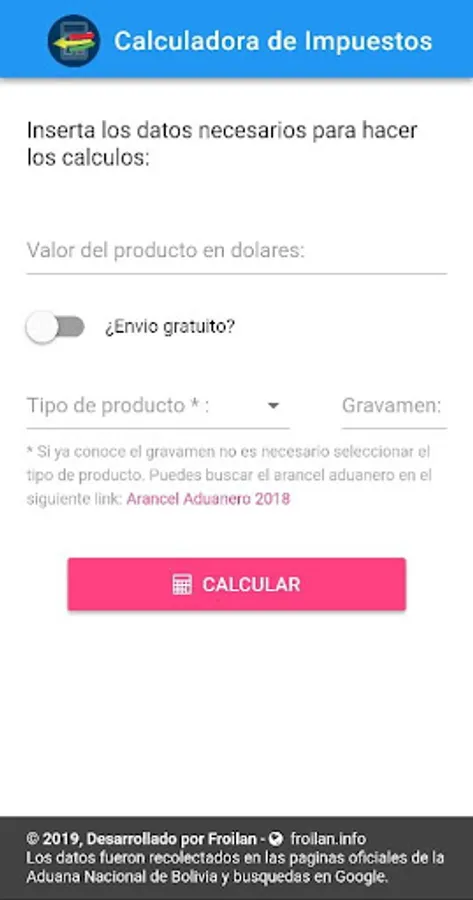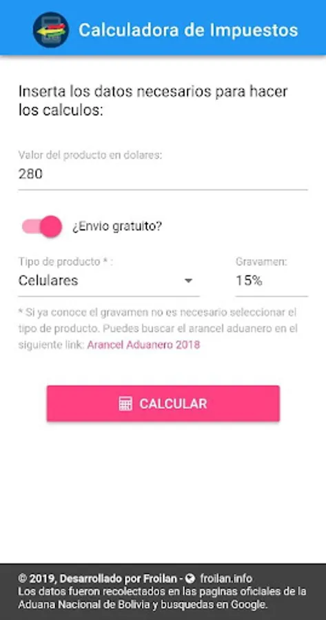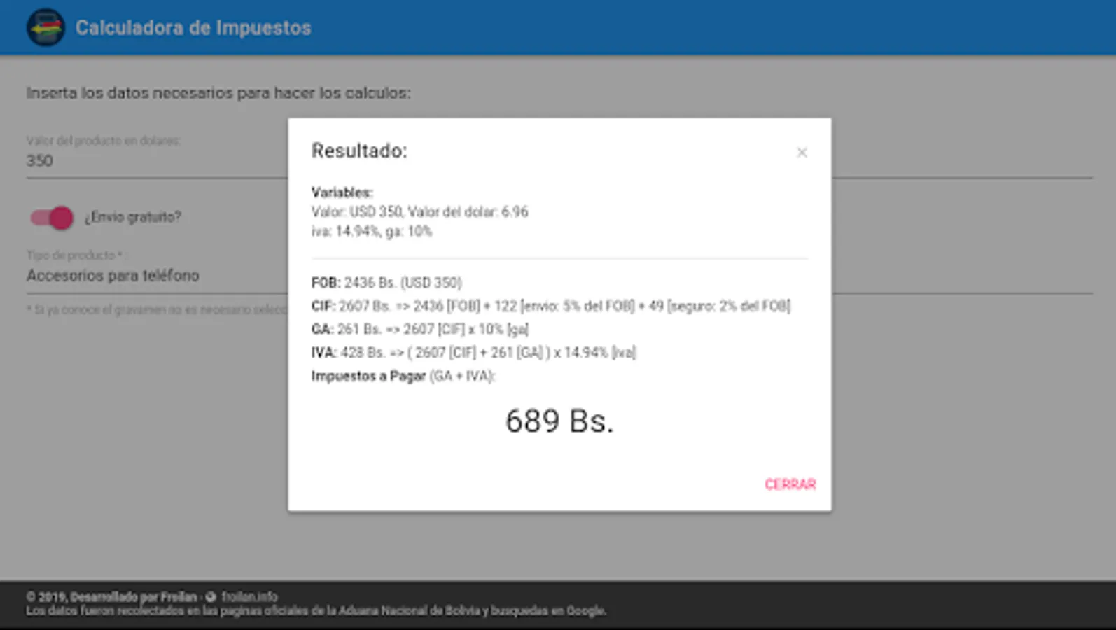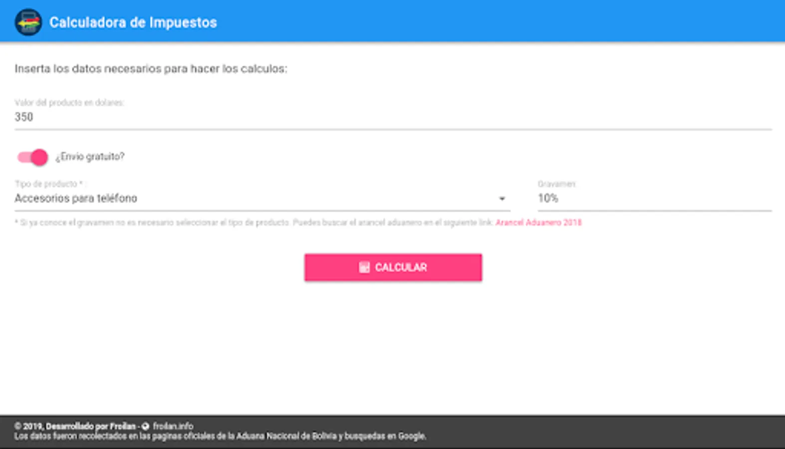 We have a calculator for you where you can estimate the taxes to be paid to Bolivian Customs.