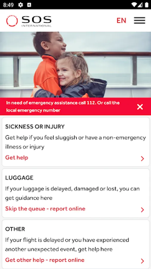 Assistance requests submitted via this app must be non-acute and could relate to sickness or injury, luggage, flight delay, and/or direction to nearest and most appropriate local treatment facility.