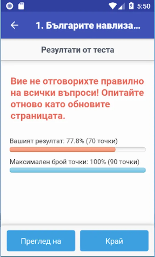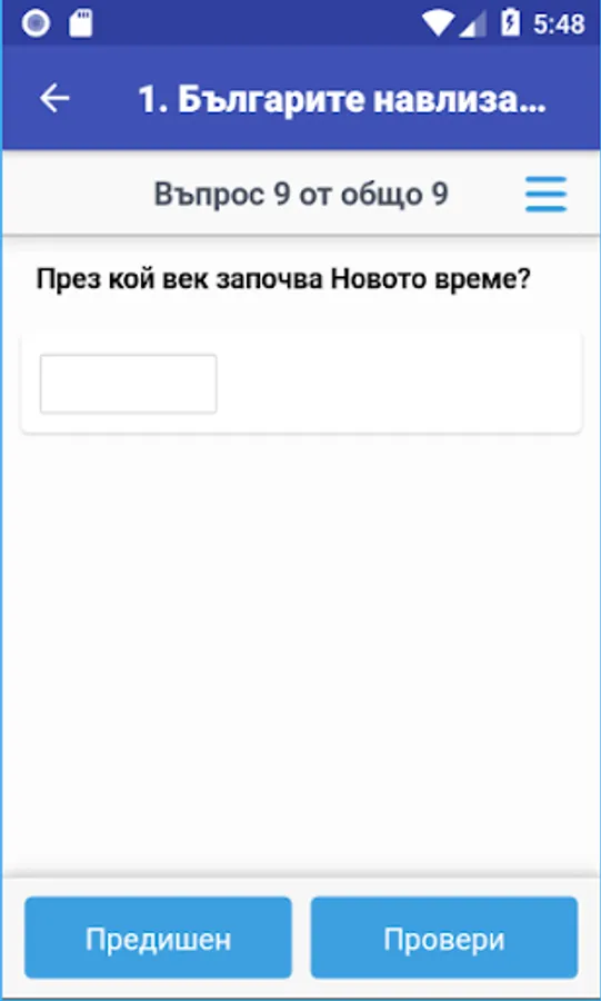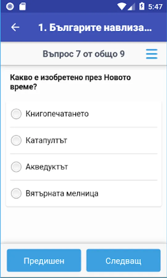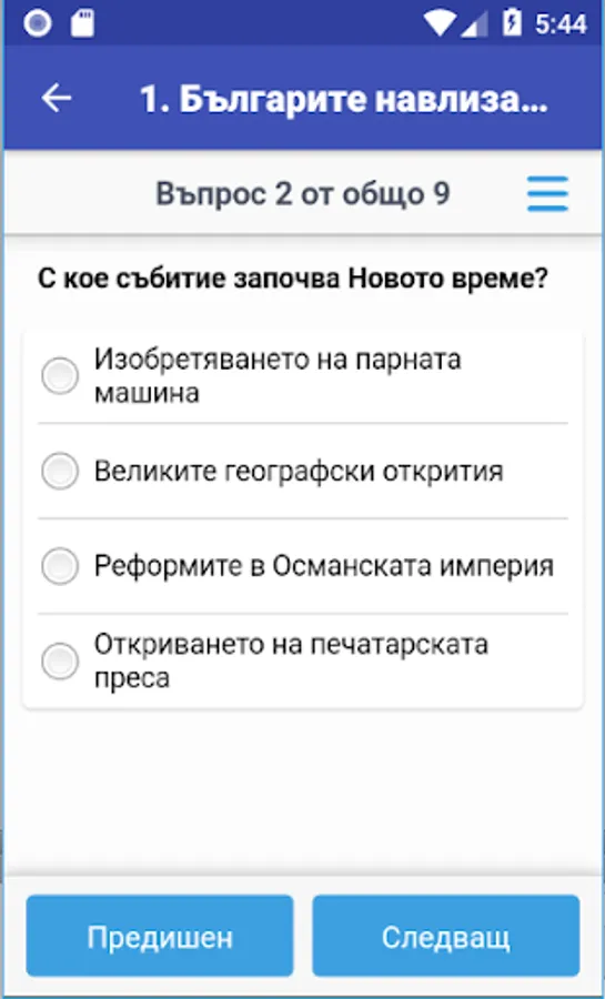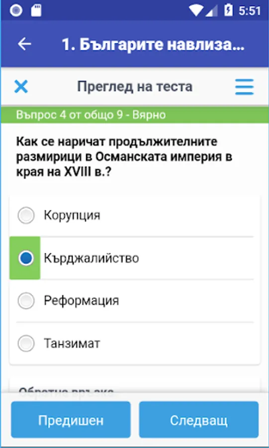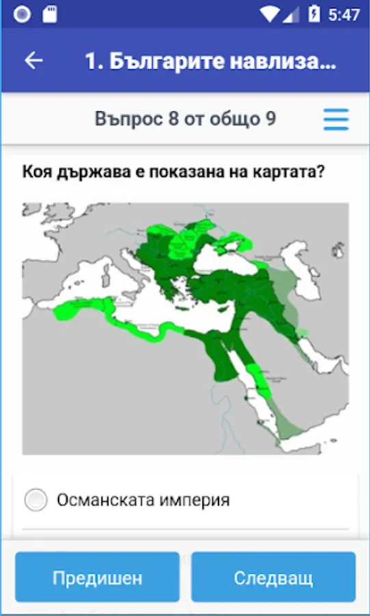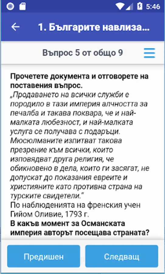 Each test contains 10 randomly selected questions from 10 types of tasks (for factology, chronology, personalities, images, maps, documents, etc.). After completion, the results and the correct answers are displayed. A new opening of the test to the lesson generates 10 new randomly selected questions from the database.