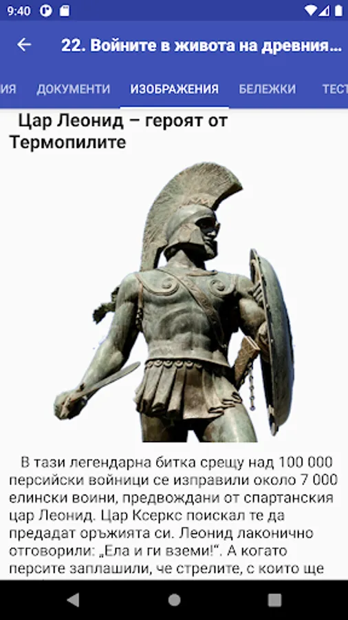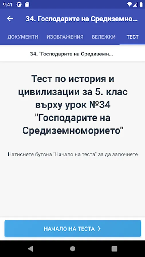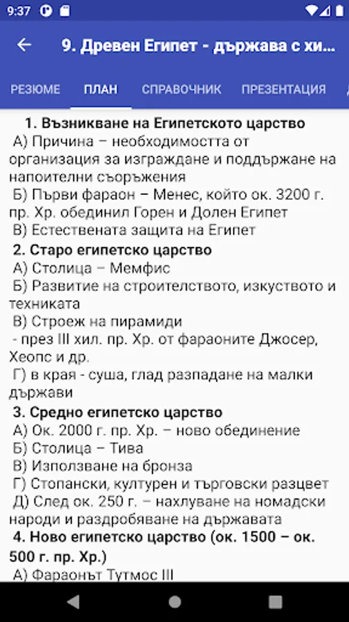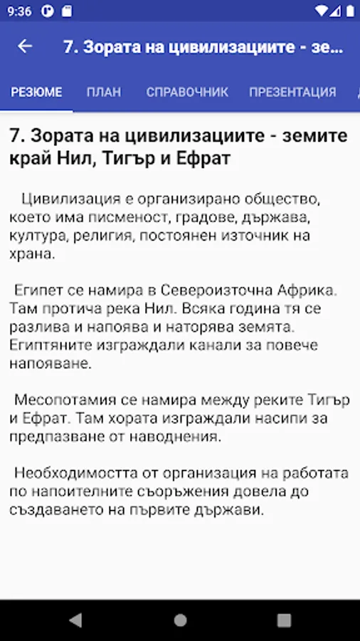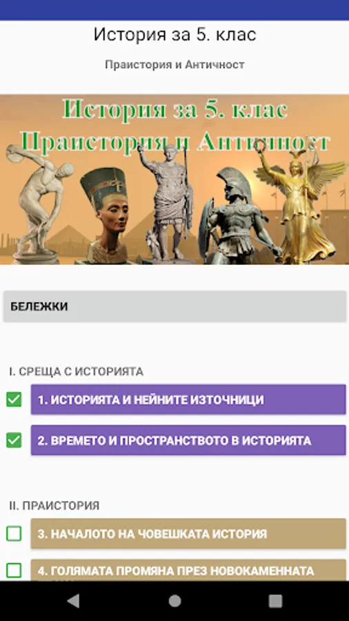 Application in Bulgarian on history and civilizations for the 5th grade under the new curriculum. It can be used by students, teachers, parents and anyone who wants to learn more about Prehistory and Antiquity.