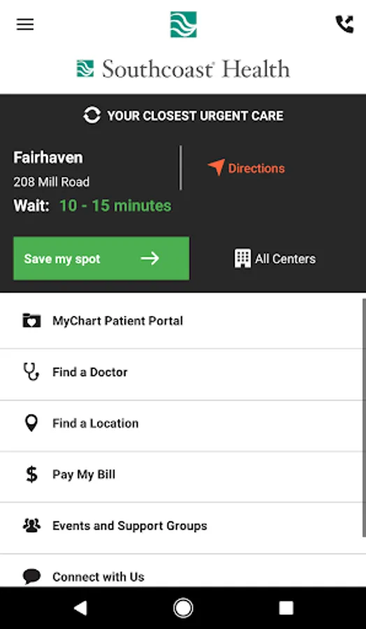 Southcoast Health mobile app provides patients and families with a one-stop mobile information hub for navigating the patient experience. Benefits to app users include access to hundreds of medical providers in the Southcoast Health Network, and its three acute-care hospitals, dozens of ambulatory locations and growing lineup of Urgent Care centers. Users can locate the closest Urgent Care center, see its current wait time, and reserve an appointment from within the app.