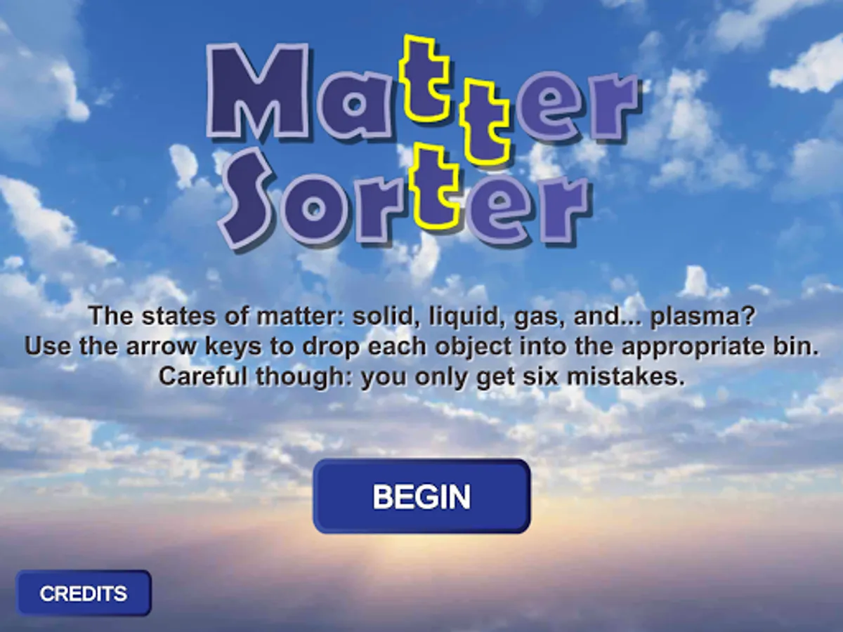 You know the “states of matter”, right? Solid, liquid, gas…. and plasma? Test your knowledge by sorting the falling objects into the appropriate bins. Be careful though: you’re only allowed a few mistakes, and each level will be faster than the last.