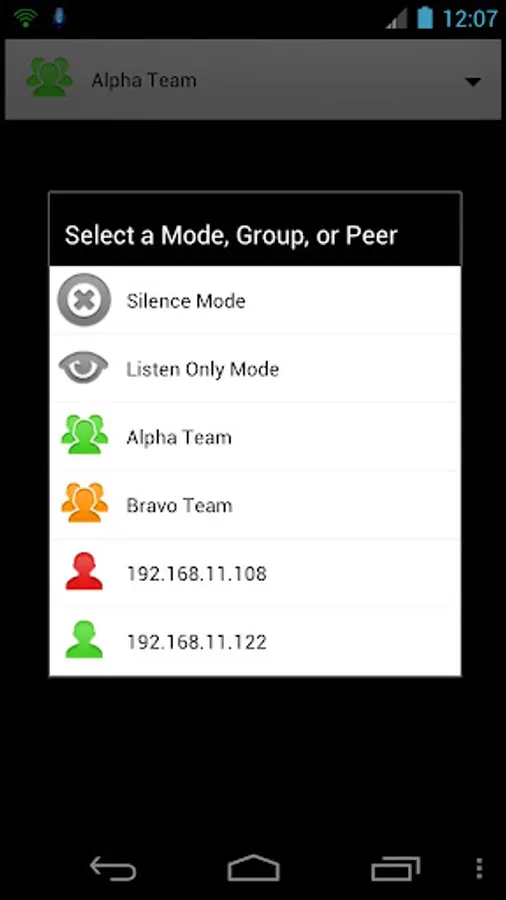 This app will automagically discover other devices in the mesh. Choose a device from the drop-down menu, hold down the mic button, and start talking. You can also create groups of peers and chat with them all at once.