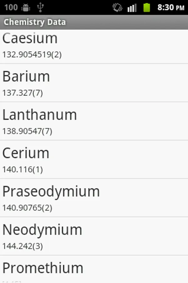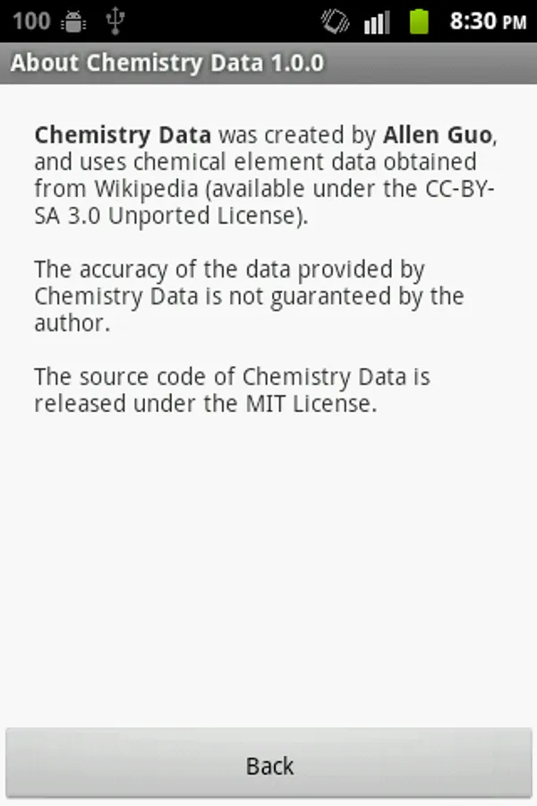 The data in Chemistry Data comes from Wikipedia, a free encyclopedia. Chemistry Data requires neither internet access nor any other Android permission.