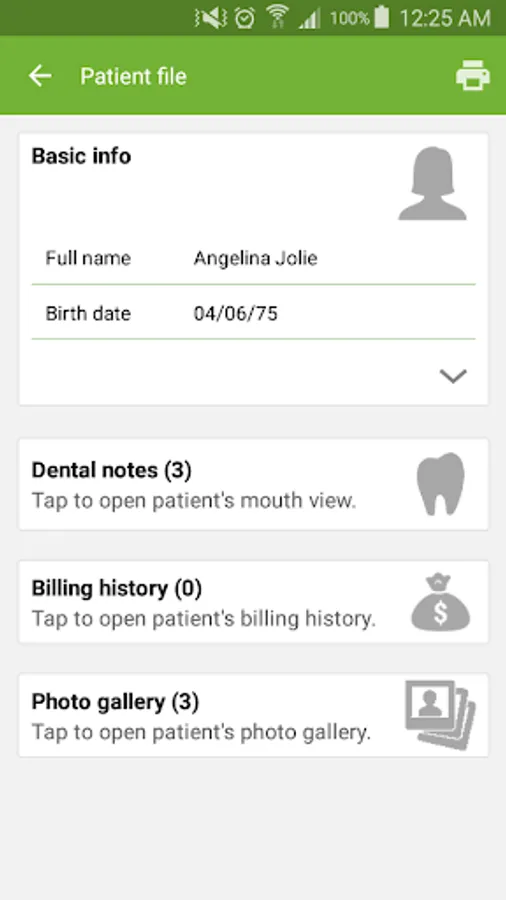 The dentist can add multiple patients, store information about them, make pictures, add them to gallery, add/edit notes in dentition view, create appointments, track payments, import / export data and print patient files, notes or payments history.