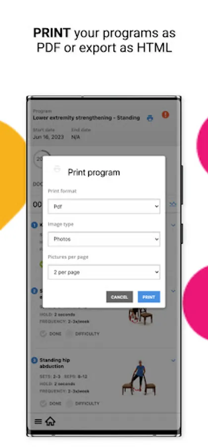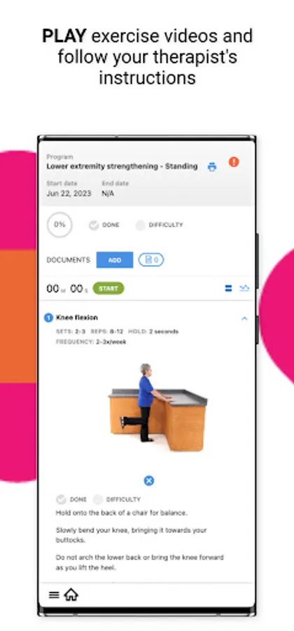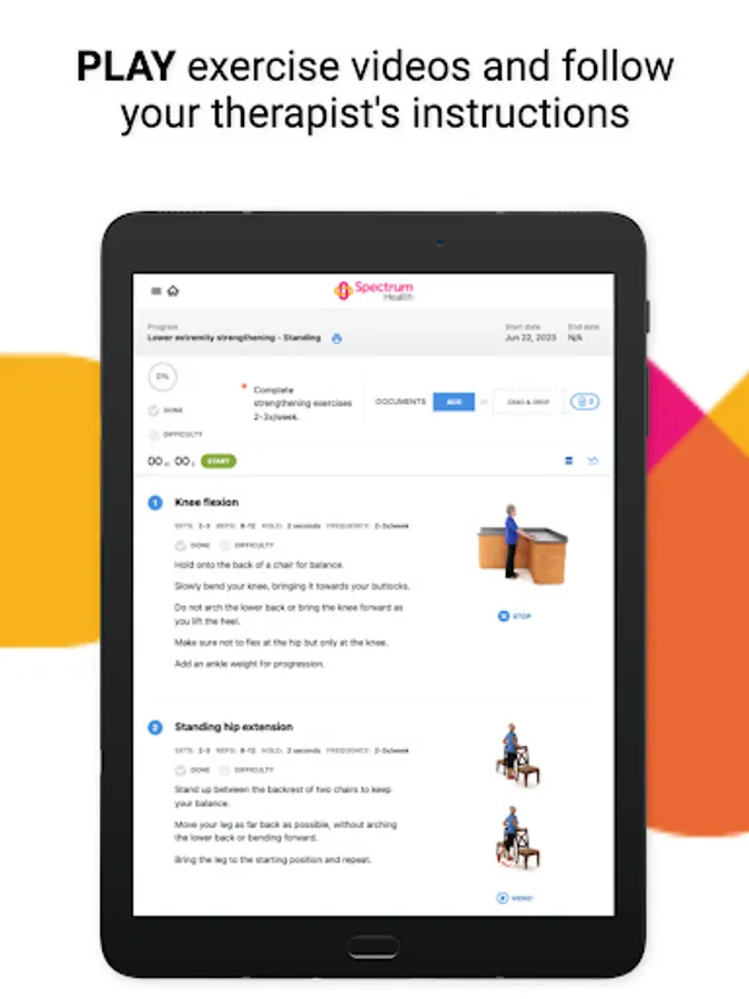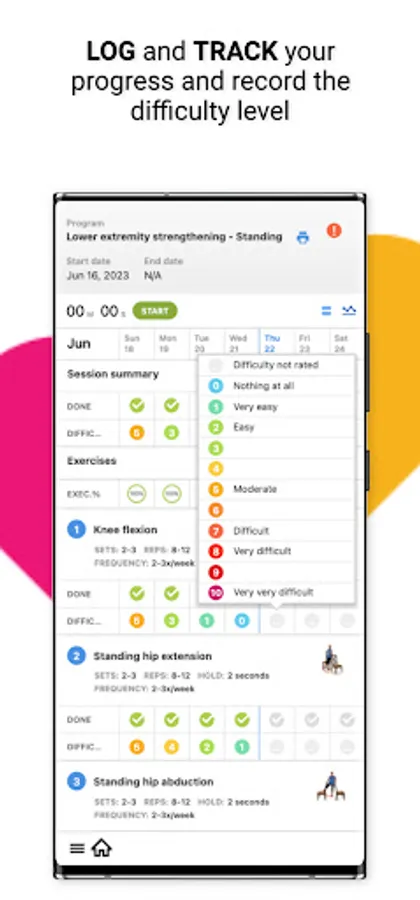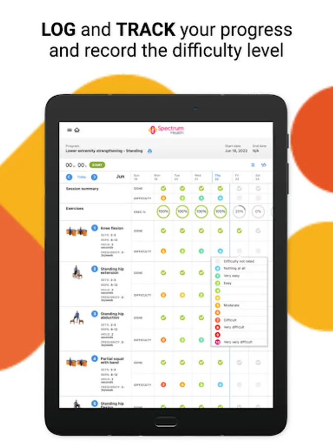 Users can monitor their progress with an interactive rating scale to track exercise completion, exercise effort and pain levels.