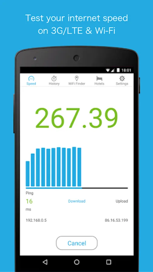 ✓ Test the Download and Upload Speed and Ping of WiFi Hotspots on dsl, adsl, cable connections.