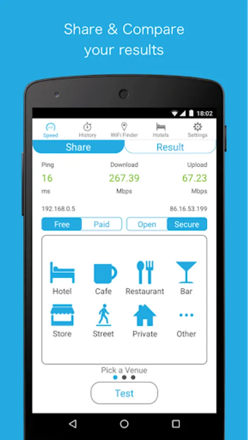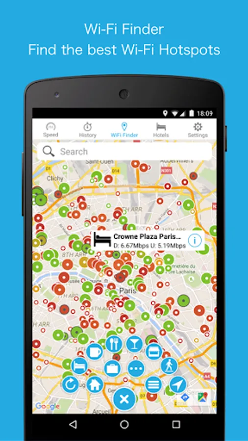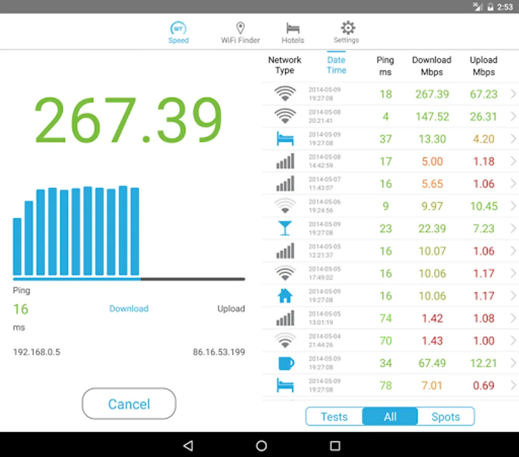Speedcheck is the only speed test that lets you test your internet connection on both Wi-Fi and cellular networks, keep track of your speed tests and contribute your results to a crowdsourced map of Wi-Fi Hotspots that shows the speed of each hotspot. You can use the included Wi-Fi Finder to find Free and Fast Wi-Fi - in Hotels, Cafes, Restaurants - anywhere in the world.