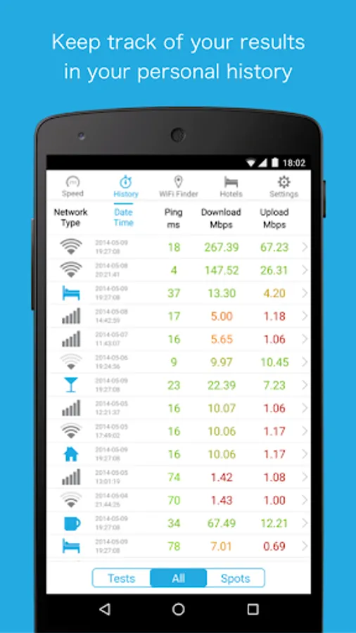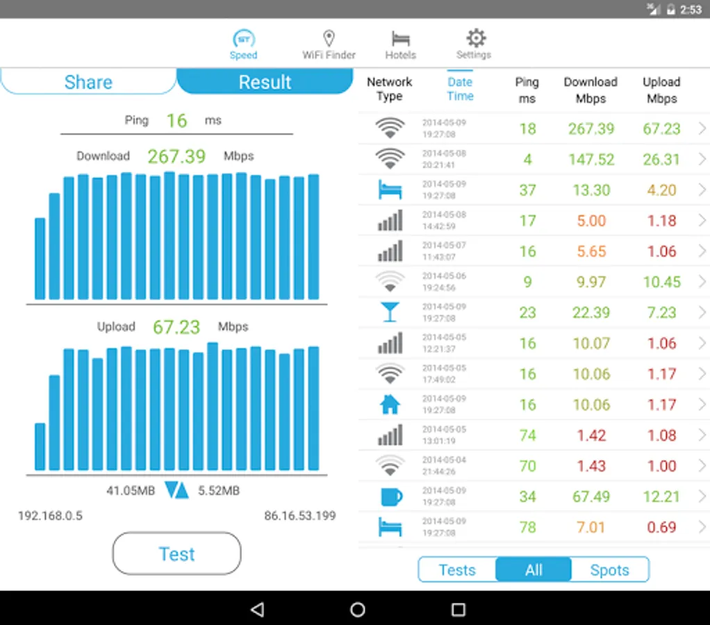 ✓ Keep track of your internet speed tests in your personal result history. The includes download and upload speed, ping, signal strength, network name, internal and external IP and the test date.