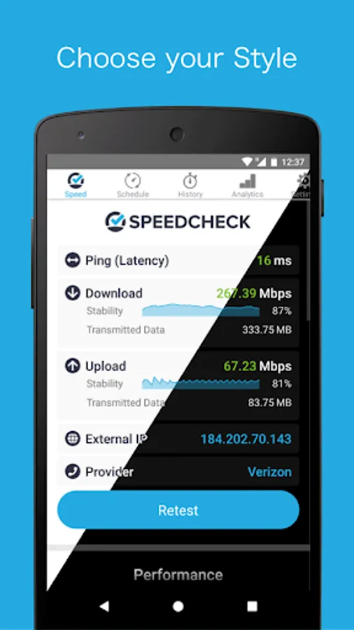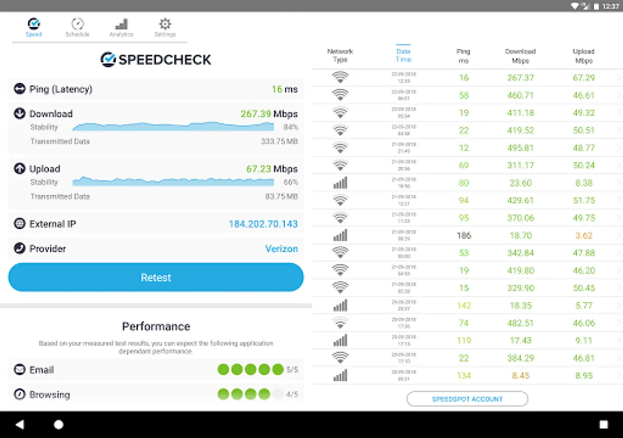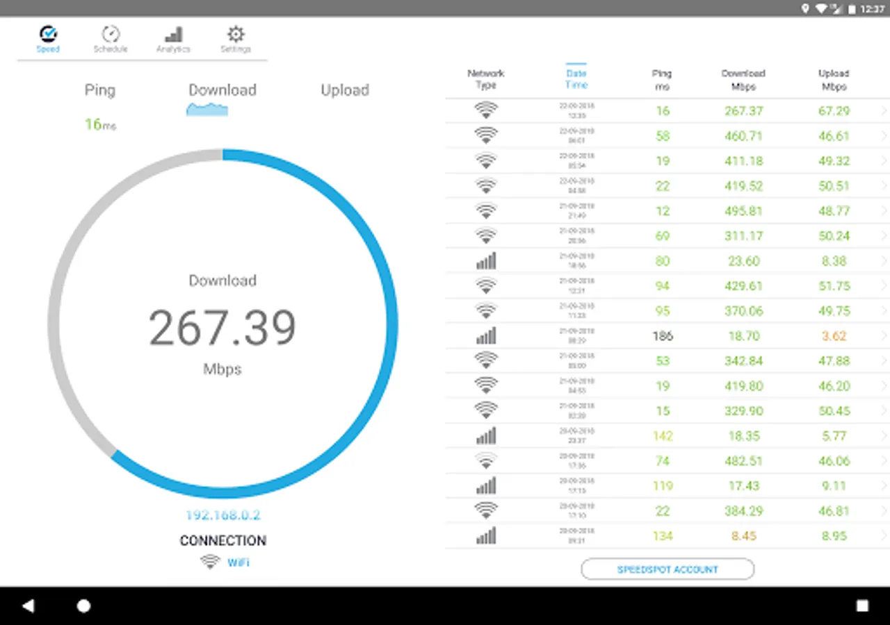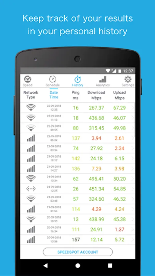 ✓ Keep track of your tests in your personal result history. This includes download and upload speed, ping, signal strength, network name, internal and external IP and the test date.