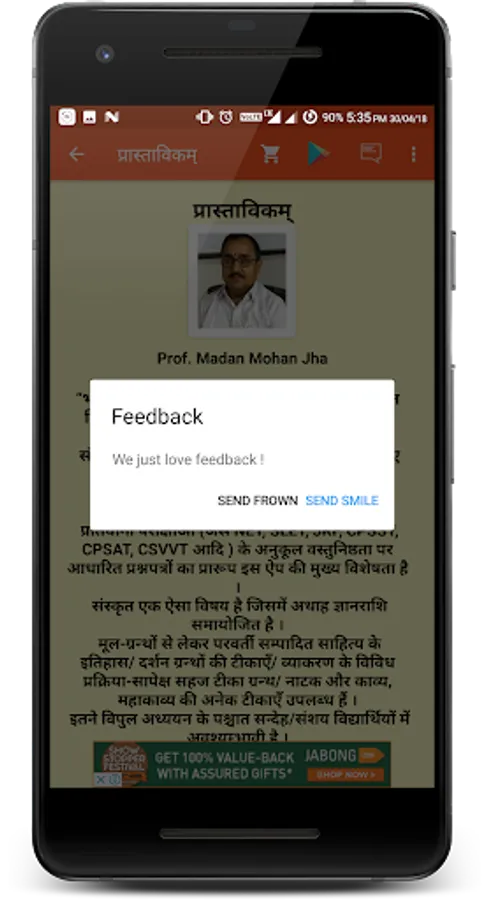 “भाषादक्षतापरीक्षणम्” नामक यह एंड्रॉयड ऐप संस्कृत विषय के स्नातक और परास्नातक की विषयवस्तु पर केंद्रित है। संस्कृत विषय के विविध प्रश्नपत्रों को ध्यान में रखते हुए इसका निर्माण किया गया है । साहित्य, व्याकरण, दर्शन, वेद आदि से सन्दर्भित प्रश्नावलियों का संकलन यहाँ किया गया है । प्रतियोगी परीक्षाओं (जैसे NET, SLET, JRF, CPSST, CPSAT, CSVVT आदि ) के अनुकूल वस्तुनिष्ठता पर आधारित प्रश्नपत्रों का प्रारूप इस ऐप की मुख्य विशेषता है । संस्कृत एक ऐसा विषय है जिसमें अथाह ज्ञानराशि समायोजित है । मूल-ग्रन्थों से लेकर परवर्ती सम्पादित साहित्य के इतिहास/ दर्शन ग्रन्थों की टीकाएँ/ व्याकरण के विविध प्रक्रिया-सापेक्ष सहज टीका ग्रन्थ/ नाटक और काव्य, महाकाव्य की अनेक टीकाएँ उपलब्ध हैं । इतने विपुल अध्ययन के पश्चात सन्देह/संशय विद्यार्थियों में अवश्यम्भावी है । अब जबकि नेट/विविध राज्यों के स्लेट अथवा सेट परीक्षाएं वस्तुनिष्ठात्मक प्रश्नावलियों पर ही आश्रित हैं । यहाँ तक कि टीजीटी/पीजीटी में भी वस्तुनिष्ठ प्रश्न पूछे जाते हैं, गहन अध्ययन किया हुआ विद्यार्थी चार विकल्पों में उलझ सकता है, संस्कृत जो कि सांस्कृतिक धरोहर है, बाज़ारवाद से बहुत दूर है आज भी । अतः योग्य कोचिंग संस्थान सर्वत्र उपलब्ध नहीं हैं । दूरदराज़ के विद्यार्थियों की पहुँच सुयोग्य विद्वानों तक नहीं है । जहाँ सन्देह का निर्मूलन सम्भव हो सके । वस्तुनिष्ठता का उद्देश्य है, संशय का पूर्णतः उन्मूलन, विशुद्ध ज्ञान की पुष्टि । ऐसे में सुधी विद्यार्थियों के हितार्थ, प्रतिभागियों के लाभार्थ, “भाषादक्षतापरीक्षणम्” ऐप में तीस से चालीस प्रारूप प्रश्नपत्र दिए जा रहे हैं । प्रत्येक प्रश्नपत्र में विषयनिष्ठ विविध प्रशाखाओं के पचास प्रश्न है, और प्रत्येक प्रश्न के चार उत्तर दिए गए हैं, जिनमें से कोई एक उत्तर सही है । शेष तीन संशय नियामक हैं । इस ऐप में एक खेल की तरह आधे घण्टे का समय निर्धारित है, अब इस आधे घण्टे में पचास प्रश्नों के सही उत्तर पर टिक करना है । यदि गलत टिक हुआ टिक किया हुआ उत्तर लाल रंग का होगा तथा जो सही उत्तर होगा उसका रंग हरा हो जाएगा फिर अगले प्रश्न पर जाने का संकेत भी हो जाएगा और उत्तर यदि सही हुआ तो सही उत्तर का रंग हरा हो जाएगा । निर्धारित अवधि के पश्चात प्राप्तांक निर्दिष्ट हो जाएगा । अब सांगोपांग अध्ययन के पश्चात प्रतिभागी संशय उन्मूलन हेतु अनेकशः अभ्यास के द्वारा अपने ज्ञान का परीक्षण कर सकता है । यह ऐप मेरे अन्य एपों की तरह पूर्णतया निःशुल्क है । अधिकाधिक प्रतिभागी लाभान्वित हो सकें यही हमारे श्रम का वास्तविक मूल्य है । सभी उपयोगकर्ताओं को कोटिशः साधुवाद..... शुभकामनाएं... और आभार.....। जिस किसी कि सामग्री का उपयोग इस एप में क