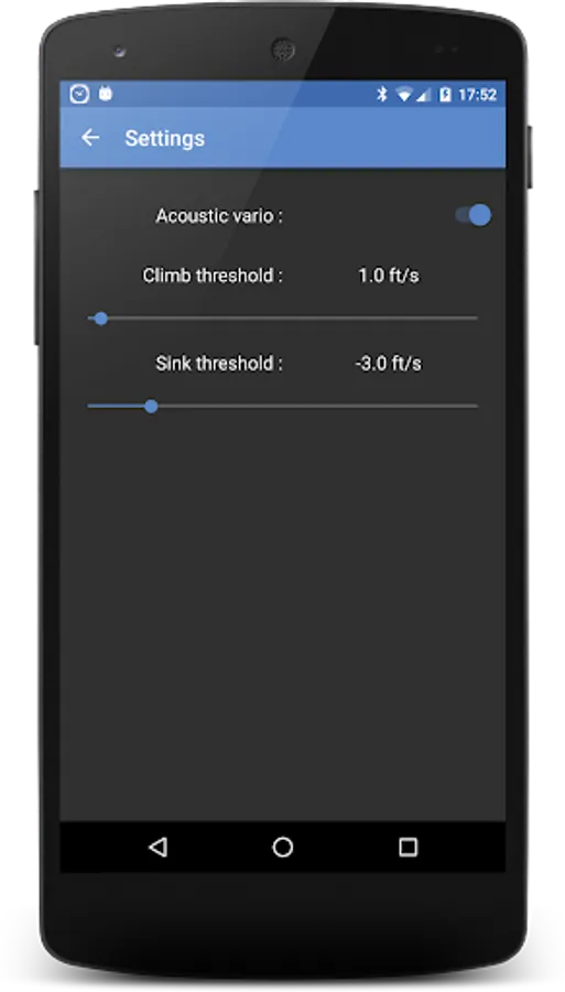 * Acoustic vario : you can set climb and sink thresholds (*),