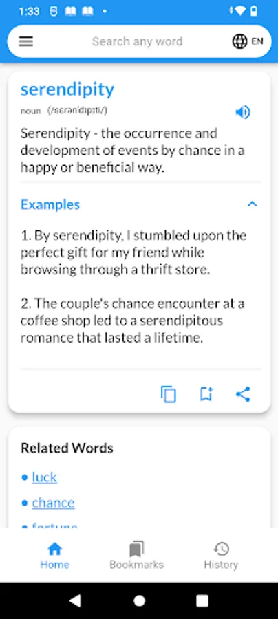 Search History: Your recently searched words, idioms, and phrases are always handy in the History screen, providing a quick way to recall and revise.