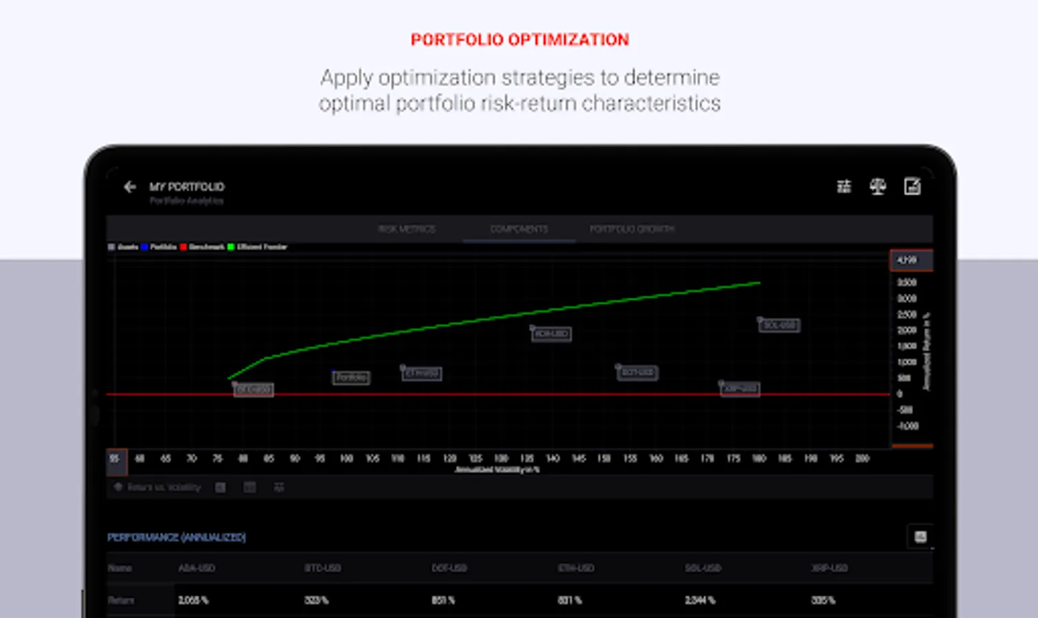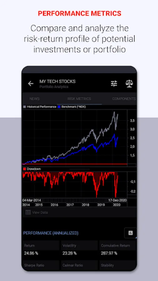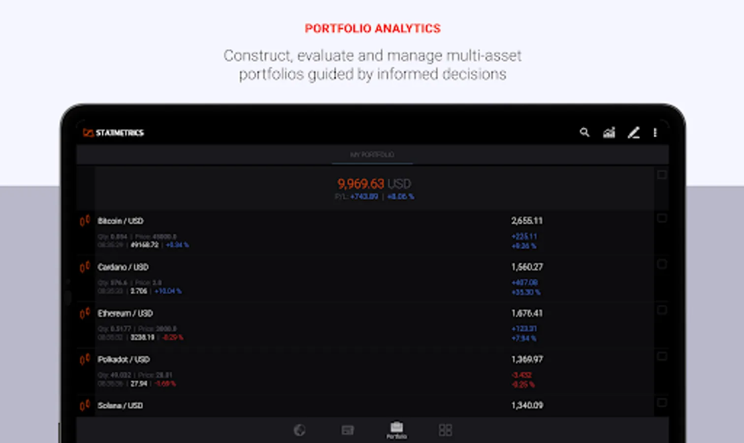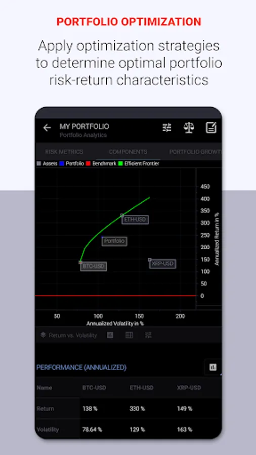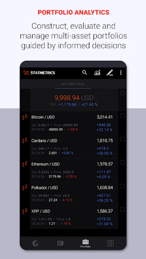 Statmetrics is a next-level solution for crypto investment analysis and crypto-asset portfolio management. Gain more confidence in your investment decisions and get insights into the risk-return profile of your crypto-asset investments. Access market news, essential cryptocurrencies and global financial market data. Forecast market trends and cycles with advanced charting and technical analysis. Construct, backtest and manage multi-asset portfolios and streamline your risk management with the integrated portfolio analytics solution. Track overall performance of your portfolio across all accounts in one place and evaluate your investment strategy. Enhance your investment research, explore investment opportunities and identify hidden risks that affect your crypto-asset investments with a comprehensive suite of analytical tools and financial models.