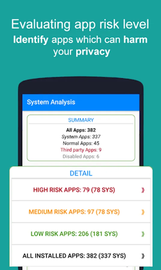 ★ Detect the high-risk apps: Evaluate all apps in your device based on their Permission or Granted Group Permission to define high-risk apps and show the owner signature and show permission list of each application.