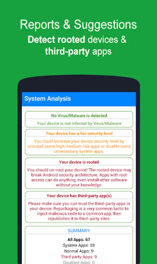 ★ Check rooted device: The rooted device break Android security architecture. Apps with root access can do anything; even install other software without your knowledge. You should un-root your device if it is rooted.