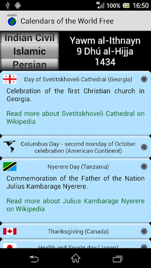 Calendars of the World is an application which allows you to view the world through the eyes of different people using their calendar. Most people around the world use the Gregorian calendar for their daily activities, but there are a lot of other calendars in the world. Those currently implemented in this application are: