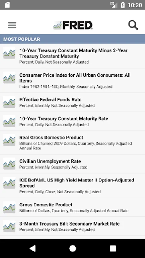 Take the economy with you wherever you go. The FRED app gets you the economic data you need — anytime, anywhere. Enjoy full access to over 508,000 economic data series from 85 regional, national and international sources. The graphs and supporting data are housed on the St. Louis Fed’s signature database — FRED (Federal Reserve Economic Database). The FRED app is perfect for students, financial market professionals, academics and anyone else interested in economic data.