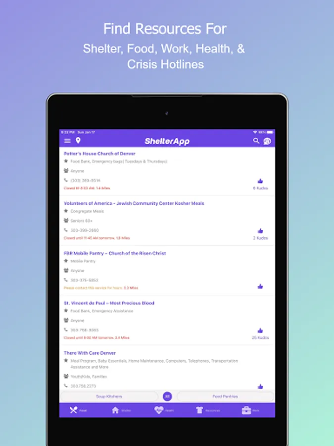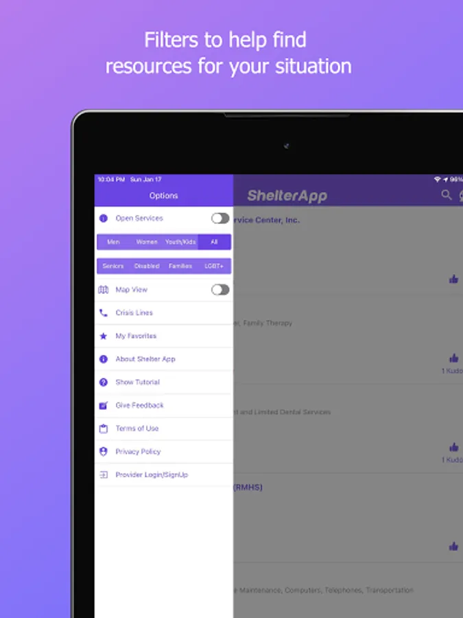 App Users can switch from List View to Map View and can filter services that are just open from the side menu. Users can click on any service to get details like contact info, transit directions and schedule for that service. Flag button on Home Screen will help you connect to the App Admin or Service Provider for that resource. Users can click on Kudos button to show appreciation for the services they like. If you want to mark any service for future reference, click on the star icon in service detail page to add them to My Favorites.