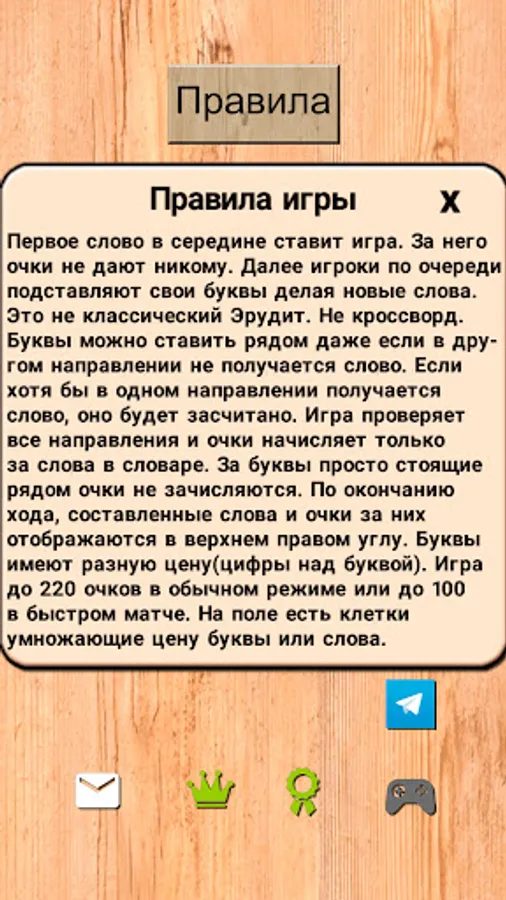 5) Otherwise, everything is according to the classics: The players have 7 letters that are randomly selected from the bag. Drag them to the game board. Letters can only be placed next to others. It is necessary to substitute the letters so that new words are obtained vertically or horizontally. The new word must contain at least one letter from the one already on the board.