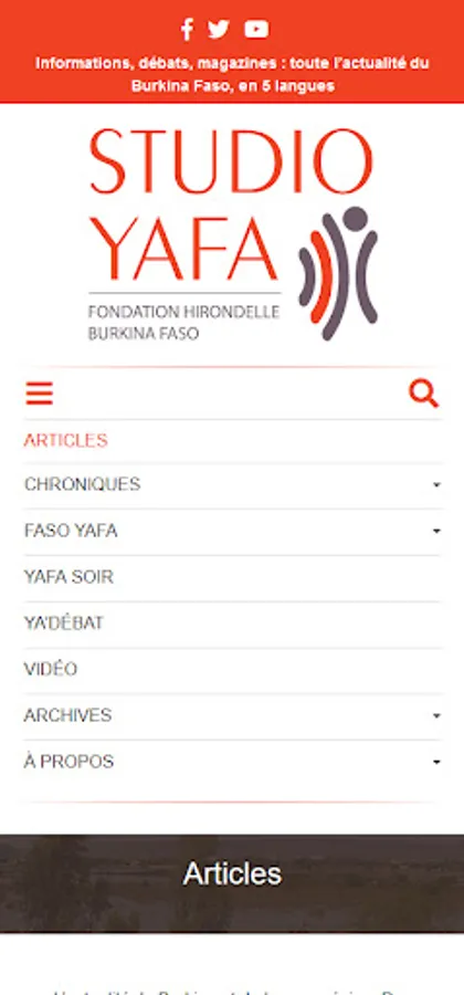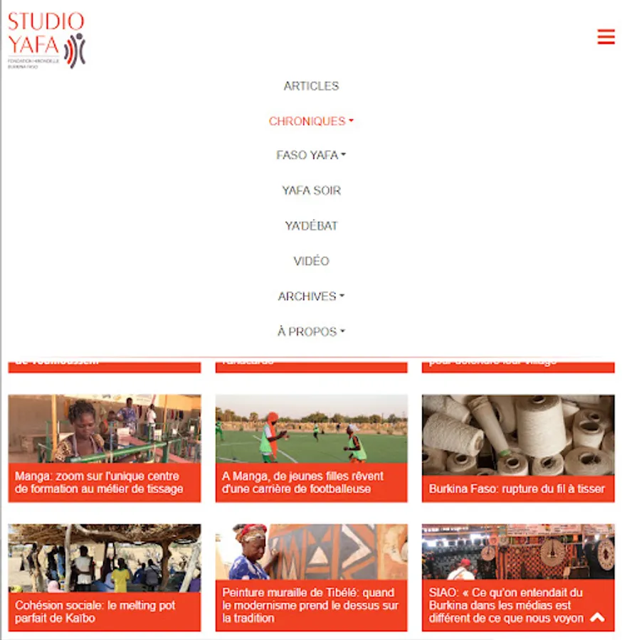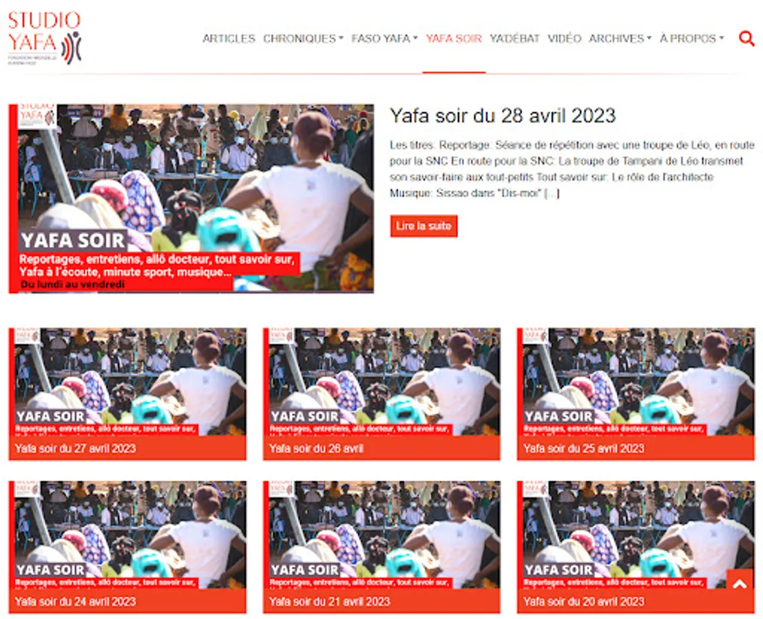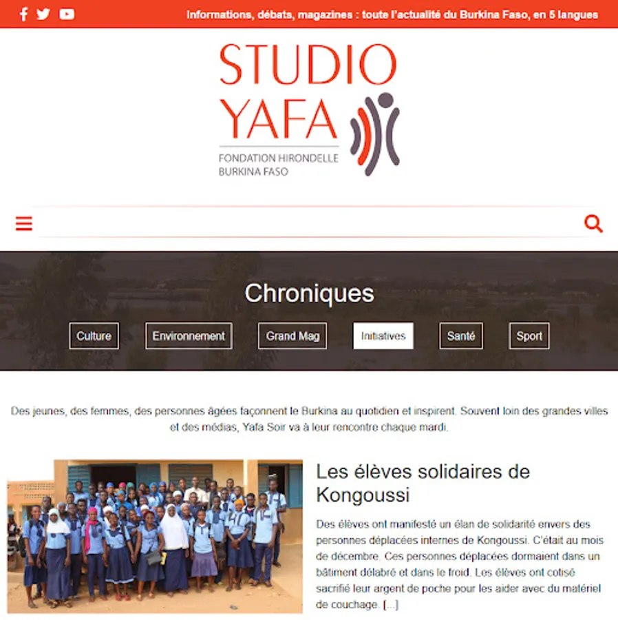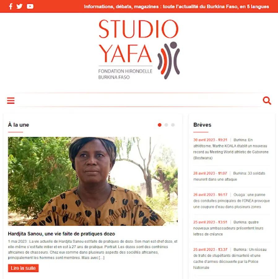 Studio Yafa is a Fondation Hirondelle media outlet established in Burkina Faso since 2018. Studio Yafa provides information and spaces for dialogue on the social and political life of the country through the production of radio, video and multimedia programs dedicated to young people, women and vulnerable people.