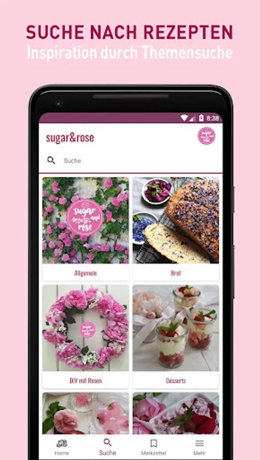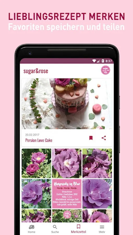 • Use the RECIPE according to various criteria such as Cakes, pies, desserts, ice cream, drinks, warm pastries, bread, stock kitchen or breakfast, Valentine's Day, Easter, Mother's Day, Christmas or Advent & Rose Allerlei (Rose salt, rose jam, rose syrup, etc.)