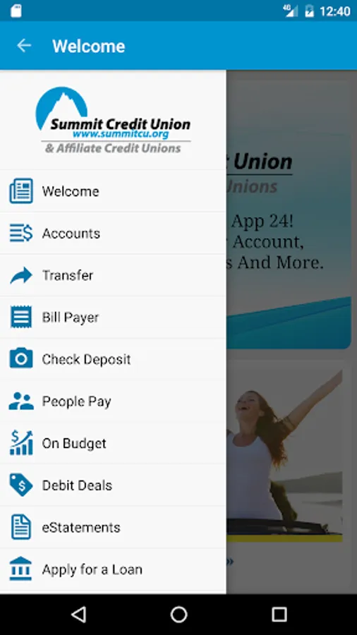 Summit Credit Union's mobile app provides easy and secure access to your Summit Credit Union accounts from your Android device. Easily check your balances, view transaction history, deposit checks, make transfers, pay bills, apply for a loan, or find nearby branch locations or ATMs. Summit Credit Union's mobile app is available to all Summit Credit Union members.