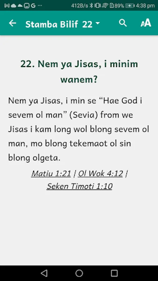 This app is written in Bislama. In the app you will find 142 questions about the important things that Christians believe. Every question has supporting Bible verses. If you study it well, it will help you understand the Biblical truths of the Christian faith. The questions are good for personal study, or for small group discussions. They will also help you recognise the problems in cults or other small groups which are in danger of moving away from the Biblical understanding of Christian faith. These are increasing throughout Vanuatu.
