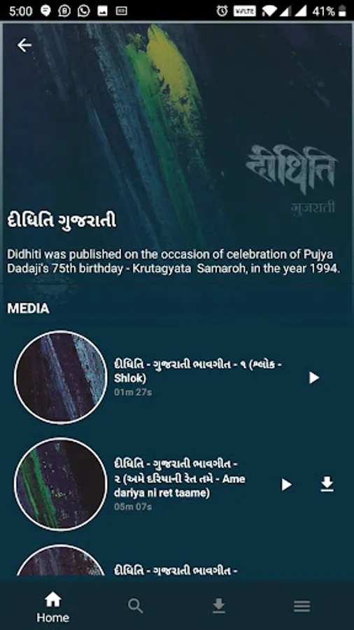 Jeevan Sampada is a religious trust inspired by Rev. Pandurangshastri Athavale (Pujaniya Dadaji), the founder of “Swadhyaya” the devotion based grassroots initiative. Over six decades, he has given thousands of discourses on Vedas, Upanishads and Shrimad Bhagwad Geeta. These discources have brought about positive transformation in cross section of the society. All the bhav geets are based on these discourses and “Sat Vichar Darshan” has the Copyright over them.