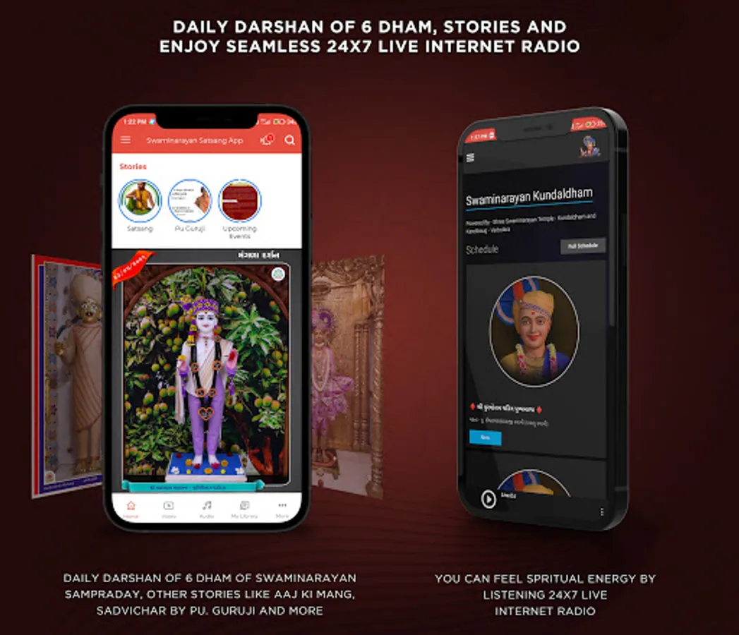 This application is a digital gateway to a collection of engaging, inspirational, and authentic Katha (spiritual discourses), uplifting Kirtans (devotional songs), mesmerizing Dhun (spiritual chant), Sadgranths (spiritual Books), spiritual blogs, audiobooks, and various collections of 3D Animation, Daily Darshan (images of Almighty lord of different pilgrimage places), Shibir-Mahotsav, Chandan na Vagha, Cultural Programs, Telefilms, Yatra-Pravas, Awareness, Hindola-Abhishek and other digital media of the Swaminarayan sect.