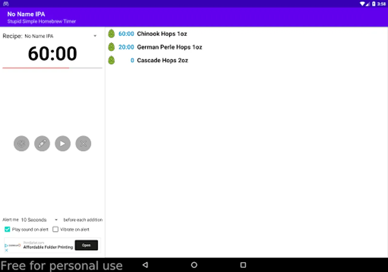 This is a simple homebrew timer to help keep track of when to add hops and other additions to boiling wort. This was made with malt extract recipes in mind, but could work for full grain brewing too.