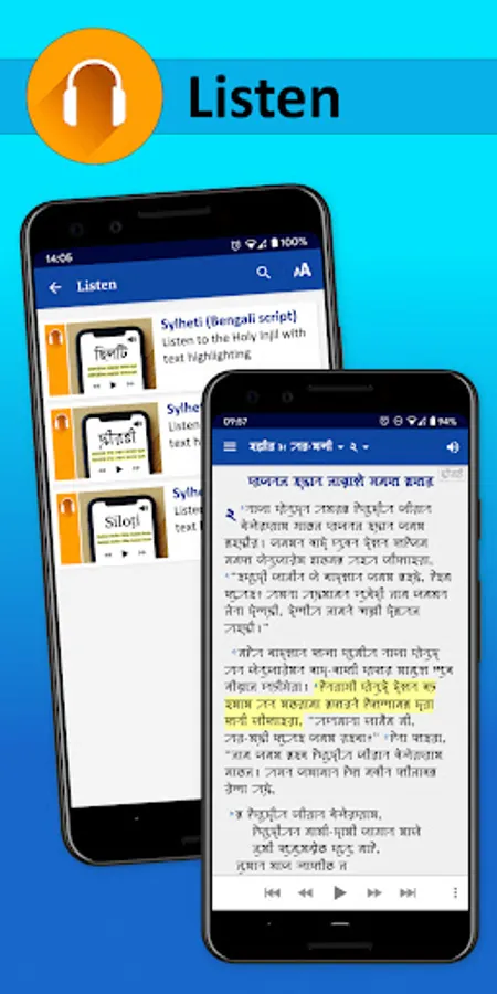 Audio of the Sylheti translation is available for every book of the Holy Injil, with phrase by phrase highlighting of the text (Bengali, Sylheti Nagri and Latin scripts) as you listen. It is also possible to slow down or speed up the audio playback (from 0.4x to 1.6x). Audio files can be streamed or downloaded.